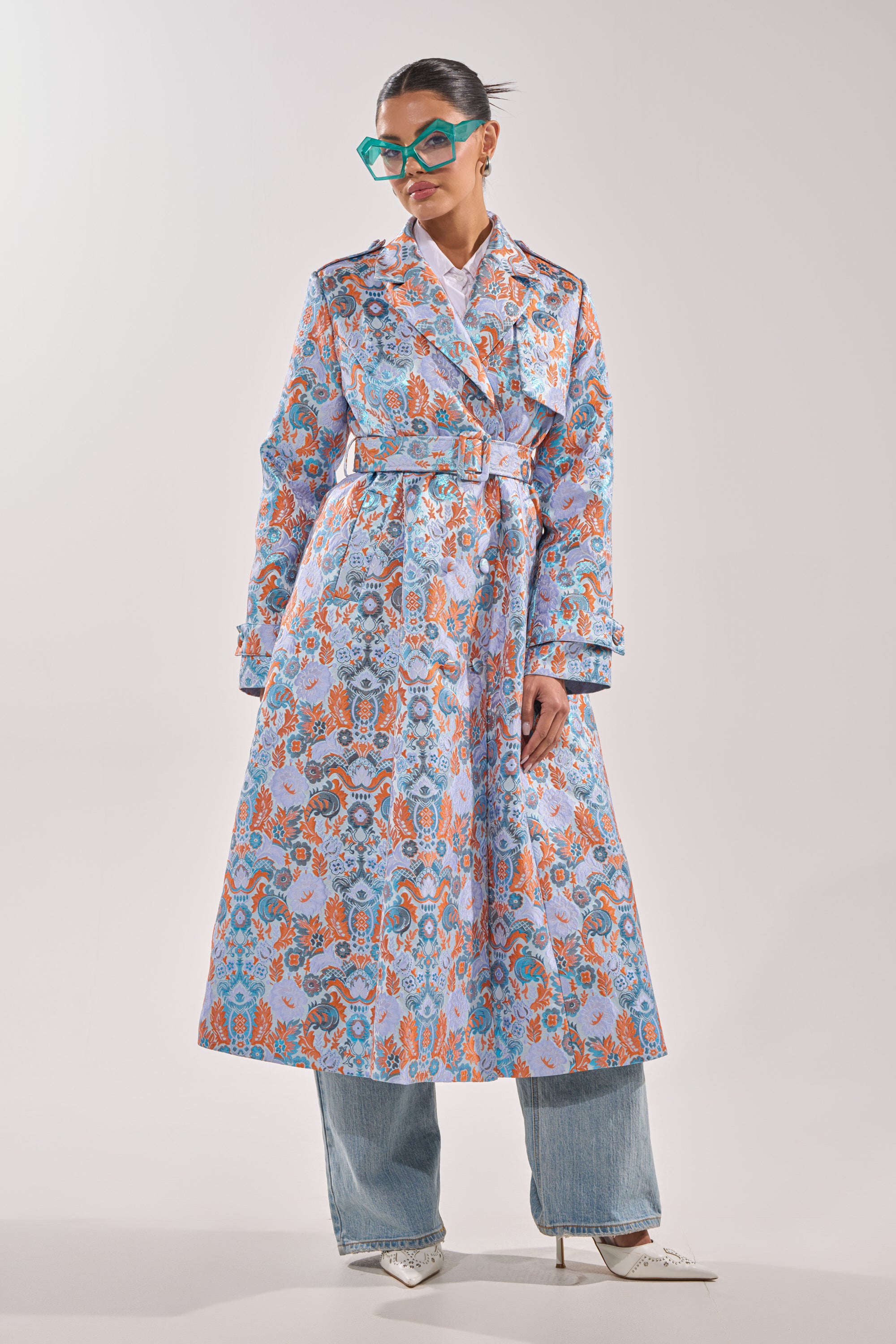 A metallic brocade full-length trench coat with an intricate, floral pattern throughout, perfect for serving elegant going-out vibes from dinner reservations to late-night events. Featuring a dramatic wide lapel collar, long sleeves with cuff straps, a belted waist with an adjustable buckle closure, a double-breasted front, discreet waist pockets, and a back vent slit. Complete with a flowing full-length silhouette. Style it over a sleek midi dress and heels for an instantly elevated after-dark look.