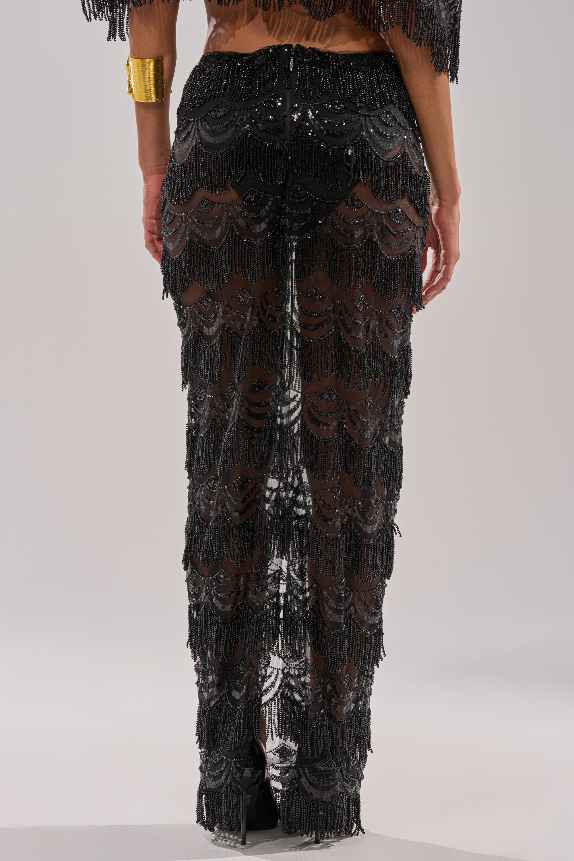 Spotlight’s on you, babe. The AKIRA Label Star Of The Night Maxi Skirt is crafted from a sheer, lightweight mesh with ornate, paneled beadwork detailing and cascading fringe accents throughout. It features a high-rise fit, a concealed back zipper closure, built-in panties, and a scalloped hemline. Complete with a curve-hugging, maxi-length silhouette. Pair with the matching AKIRA Label Star Of The Night Blouse, strappy stilettos, and a red lip for a ravishing finish.