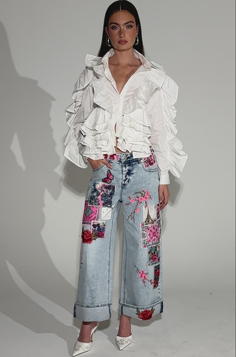 The AKIRA Label Star Of The Show Ruffle Button Down takes the classic white shirt to maximalist heights. Crafted from crisp poplin, this blouse features oversized cascading ruffles along the sleeves and bodice, adding architectural volume and movement to every gesture. A sharp collar and button-down front bring balance to its bold silhouette, while the cropped hem gives it a modern, fashion-forward finish. Perfect for statement dressing, editorial styling, or elevating denim with unapologetic drama.