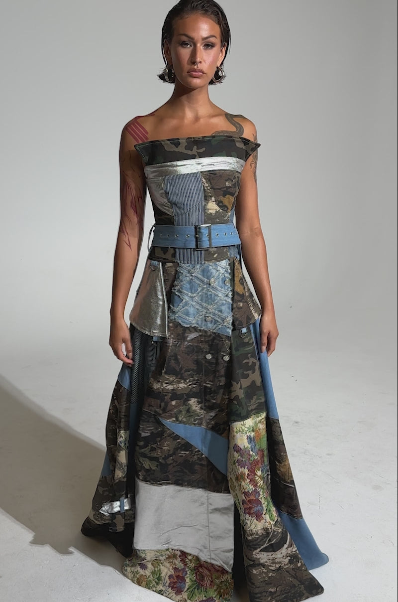 The AKIRA Label Strapless Trench Maxi Dress With Patchwork Detail is a runway-worthy statement piece that’s sure to stand out. This floor-grazing dress is crafted from a patchwork of different materials and prints including camo, distressed denim panels, floral brocades, pinstripes, metallic detailing, and textured fabrics. It features a strapless fold over pointed neckline, flared panels at the waist with silver-tone D-ring hardware, button detailing, a concealed front slit for easier movement, a back zipper closure, and a coordinating adjustable denim belt. Complete with a flowing A-line silhouette. Perfect for editorial moments, special events, or bold street style.