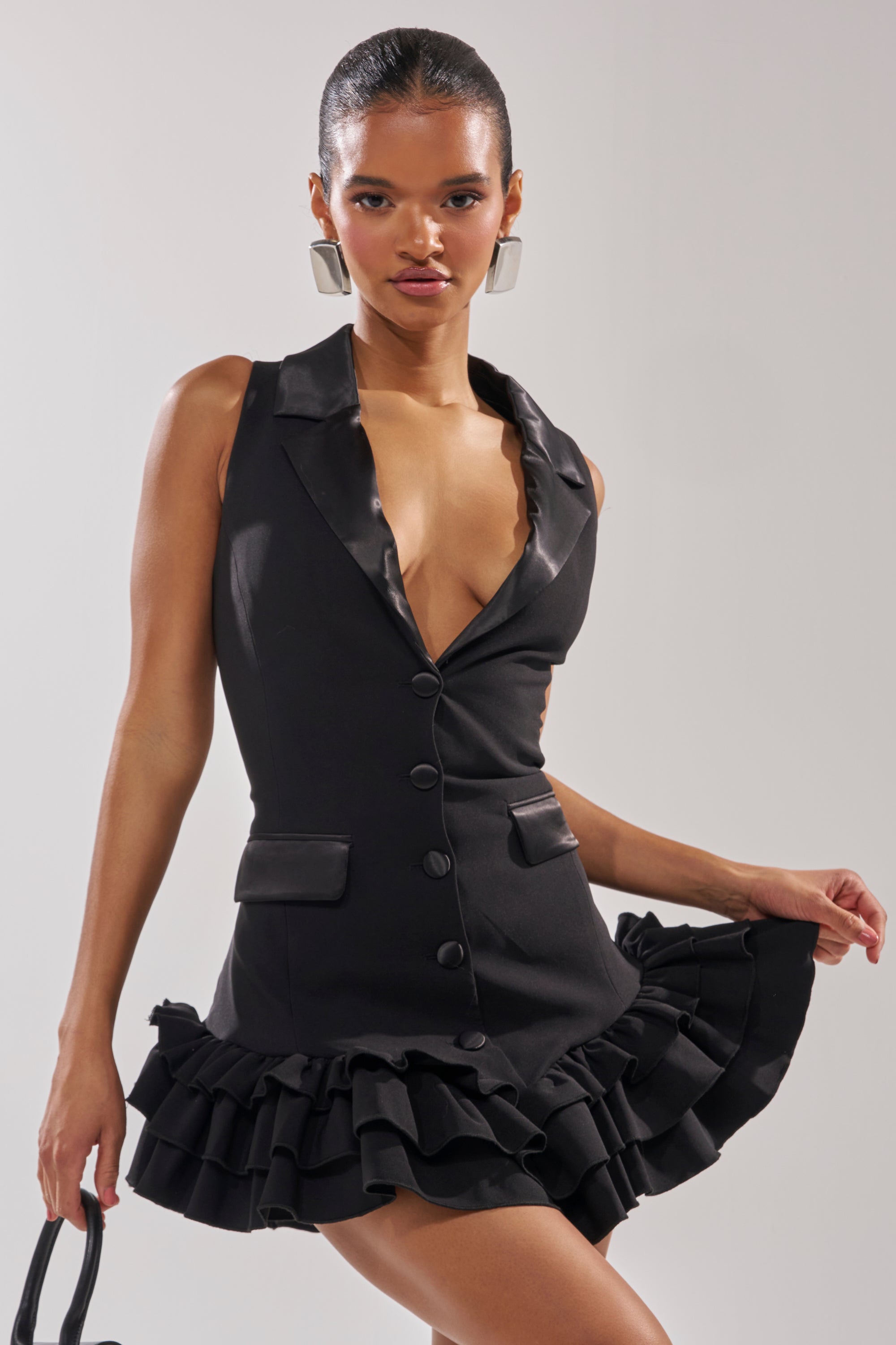 The AKIRA Label Suited Up Sleeveless Mini Dress was made for power moves. Crafted from a sleek suiting fabric, this blazer-inspired piece features a tonal satin notch lapel collar, a plunging neckline, a sleeveless design, a sculpted bodice with button front closures, and dual waist flap pockets. The lower half boasts a lace-up back panel and a tiered, ruffled hemline. Complete with a mini-length silhouette. Pair with stiletto pumps, an oversized blazer, and a clutch for a finished look.