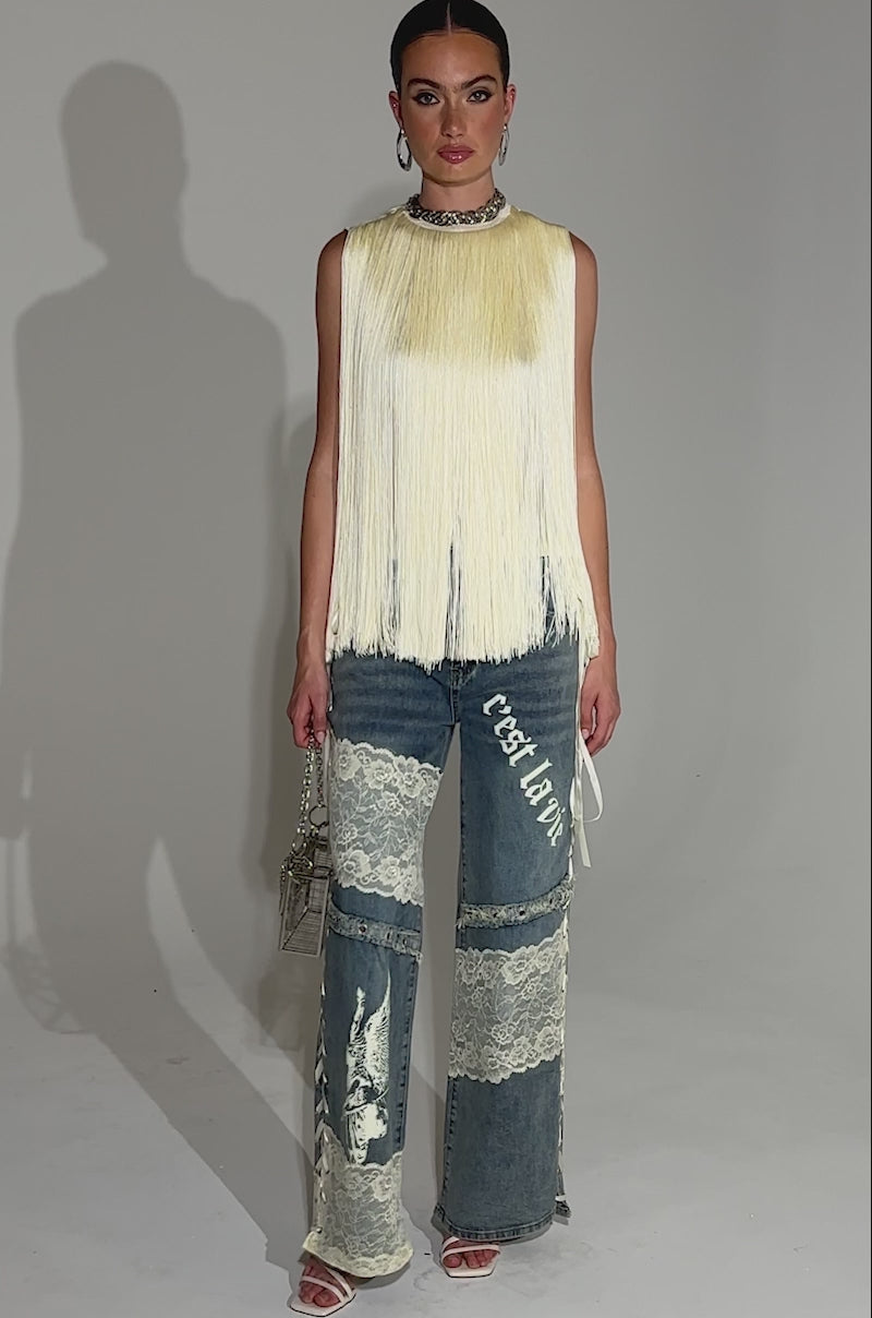 The AKIRA Label Sunshine Lover Fringe Blouse was designed with the summer girlies in mind. Crafted from a smooth, stretchy base fabrication in an irresistible butter-yellow hue, this top features a cropped, sleeveless silhouette, a high woven neckline, and layers of silky tonal fringe that cascade from the neck and shoulders and past the primary hem. Complete with a keyhole opening and tonal button fastenings at the nape of the neck.