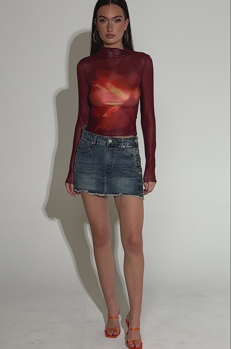 Glow all out in The AKIRA Label Sunshine Lover Mesh Long Sleeve. Crafted from sheer and stretchy mesh, this top features an abstract print on the front, a mock neck, long sleeves, and a curve-hugging fit. Layer with a sultry bralette, baggy cargo pants, and stiletto booties for an effortlessly cool ensemble.