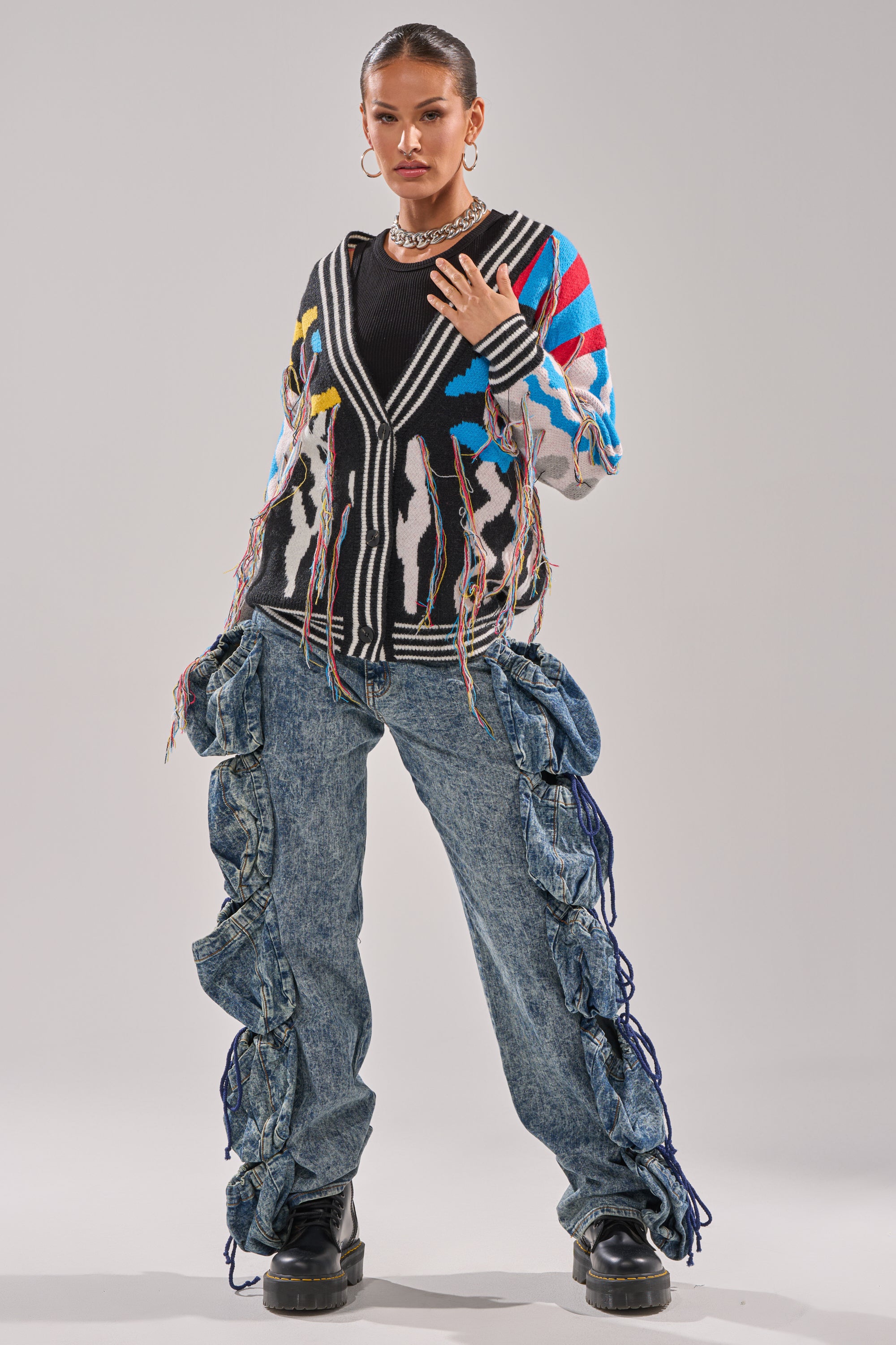 It’s that time of year… The AKIRA Label Sweater Weather Cardigan is crafted from a cozy knit fabric with an abstract figure pattern in electric, colorful hues. It features a deep V-neckline, striped ribbed trim on the hemlines and cuffs, playful fringe yarn detailing scattered throughout the front, and button front closures. Complete with a relaxed, oversized fit.