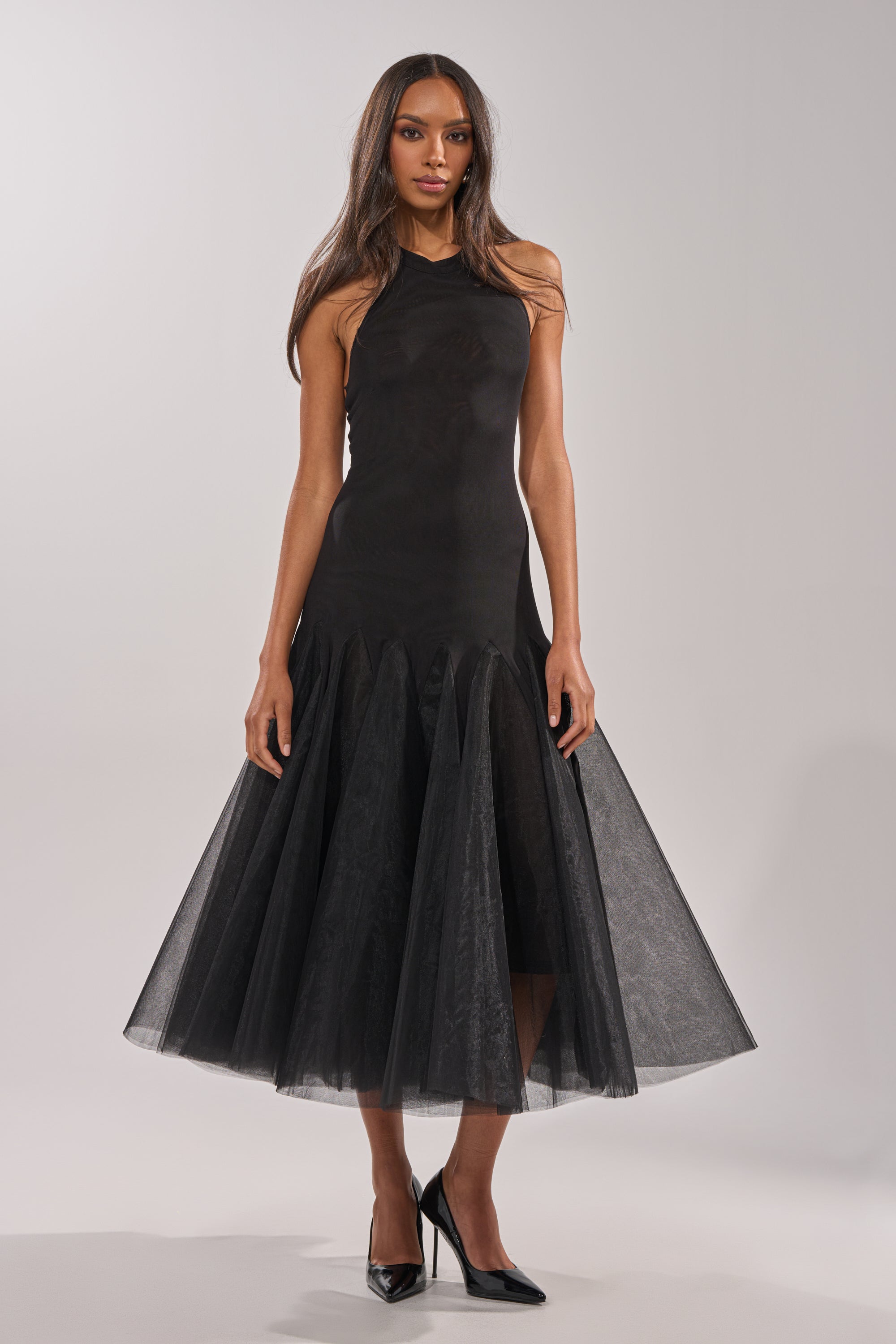 Elegant black halter midi dress with tulle mermaid skirt perfect for formal events, cocktail parties, or elevated evening occasions. Crafted from a smooth, figure-contouring mesh fabric, this timeless dress features a sleek high halter neckline with a double button closure, fitted bodice with a back zipper enclosure, and a softly flared tulle hem that adds movement and drama. The minimalist silhouette is balanced by the airy layered skirt, creating a refined yet striking look. Ideal for weddings, galas, or sophisticated nights out, this dress delivers classic elegance with a modern, feminine edge.