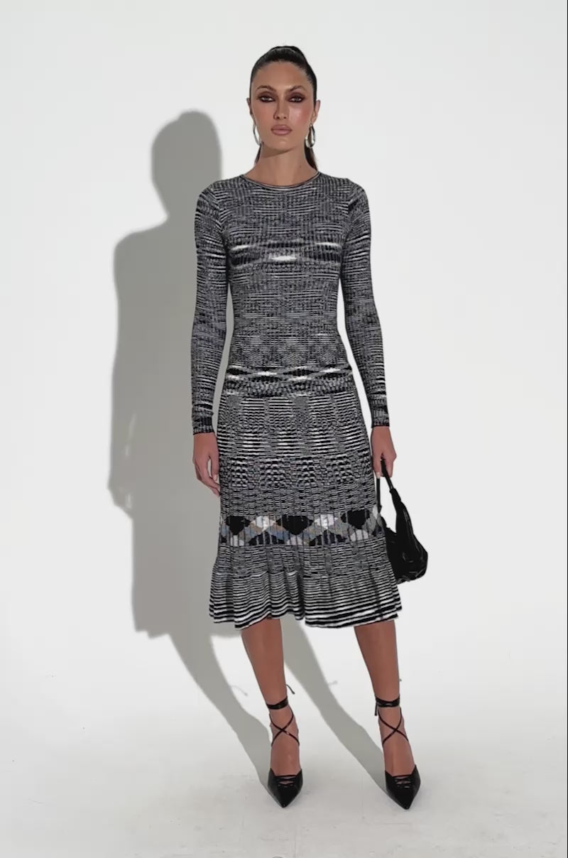 The haters will stay in their lane when they see you in The AKIRA Label Swervin Knit Maxi Dress. This cozy style is crafted from a stretchy knit base and features a two-tone, abstract striped pattern throughout, a rounded neckline, long sleeves, and a subtle ruffled bottom hem. Complete with a curve-hugging silhouette, a maxi length, and an easy, pull-on fit. Pair with stiletto boots and an oversized leather jacket for a finished look.