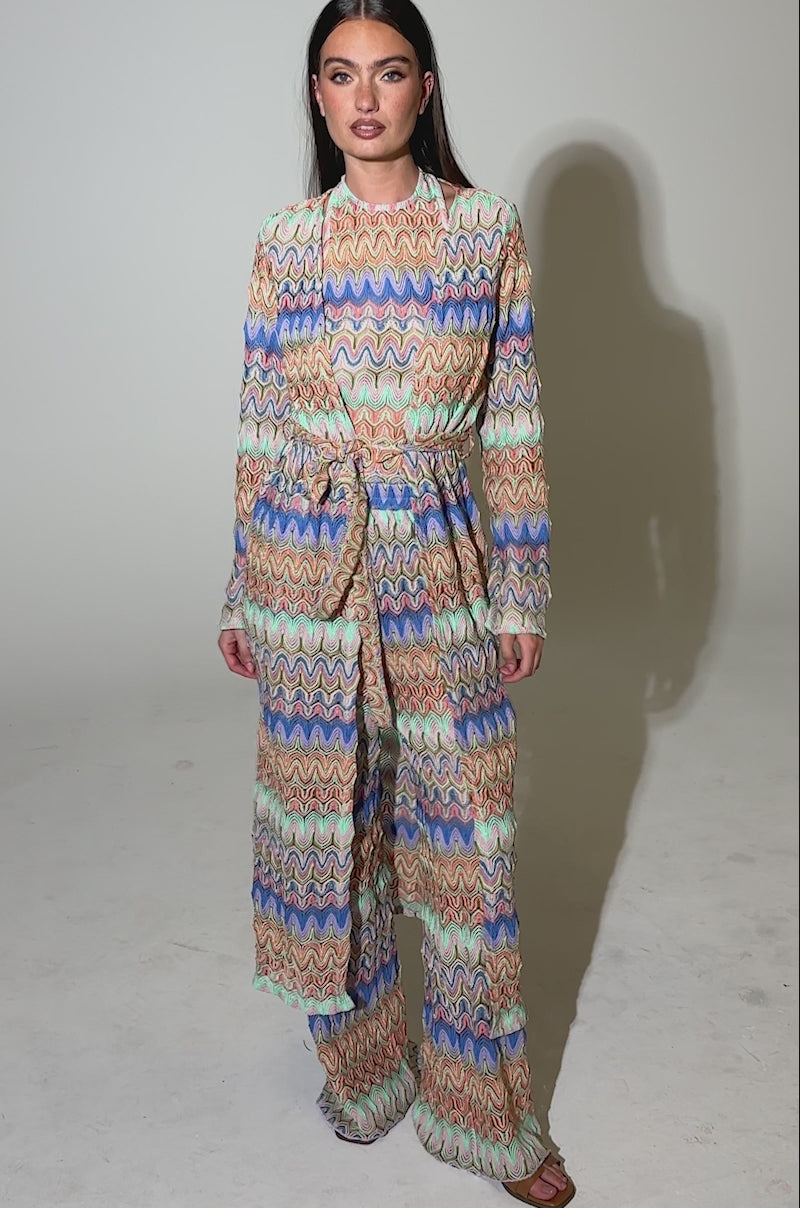 Bring the heat in The AKIRA Label Take Me To Miami Duster. This psychedelic piece boasts a zany crochet pattern in vibrant pastels and subtle metallic threading. It also features a robe-like, maxi-length silhouette, long sleeves, an open-front design, a self-tie waist belt, and a breezy, unlined construction. Style it atop the matching palazzo pants and halter top for a retro-inspired, resort-ready look.