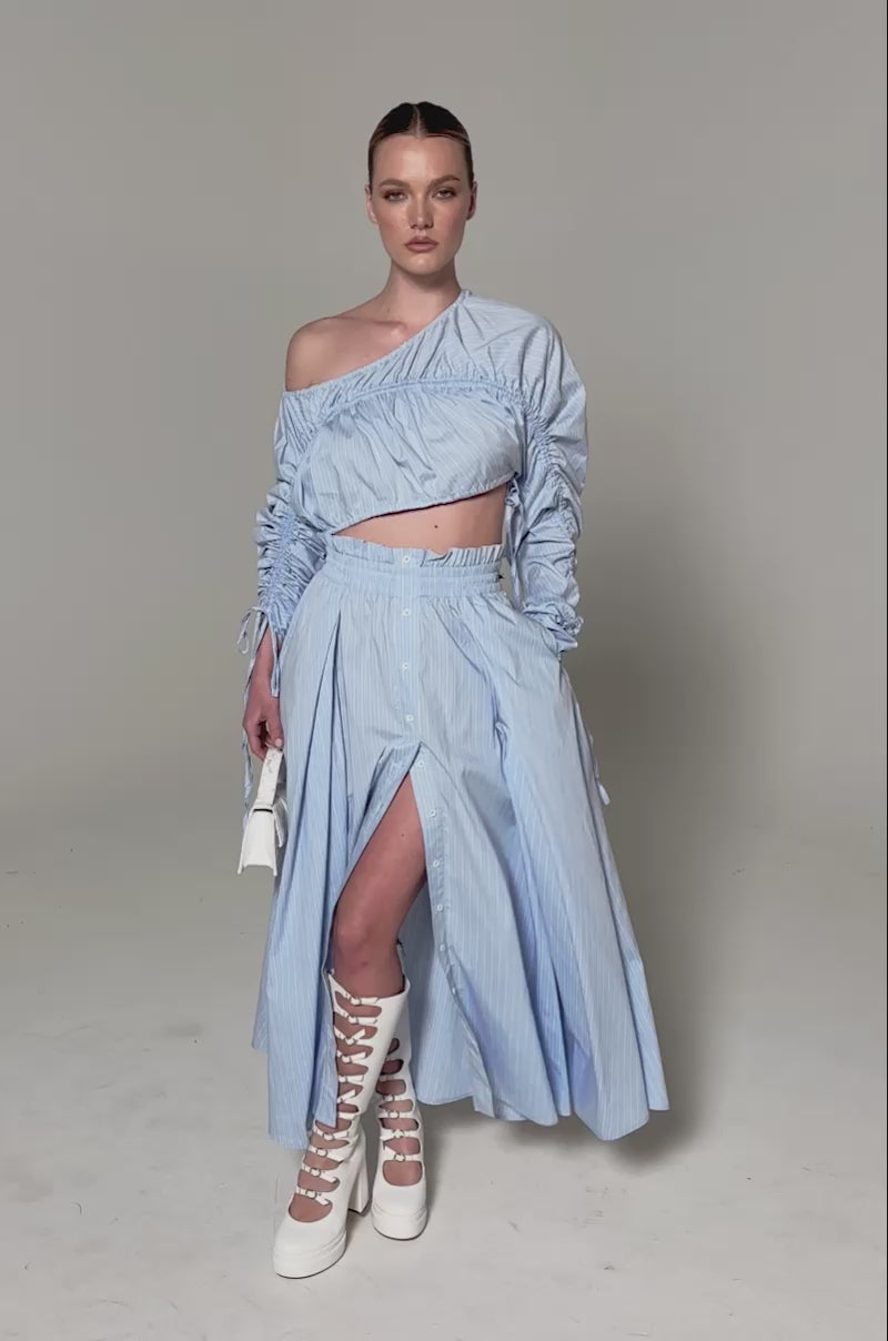 Fashion speaks louder than words in The AKIRA Label Talk To Me Maxi Skirt. Crafted from lightweight, breathable cotton with a classic pinstripe pattern, this charming skirt features a high-rise, shirred elastic waistband with bungee cord side closures and subtle ruffle detailing, a center front placket with button closures for an optional slit, and on-seam side pockets. Complete with a flowing, A-line silhouette, and an easy pull-on fit. Style with the coordinating AKIRA Label Talk To Me Cinched Blouse, stiletto pumps, and hoop earrings for a polished finish.