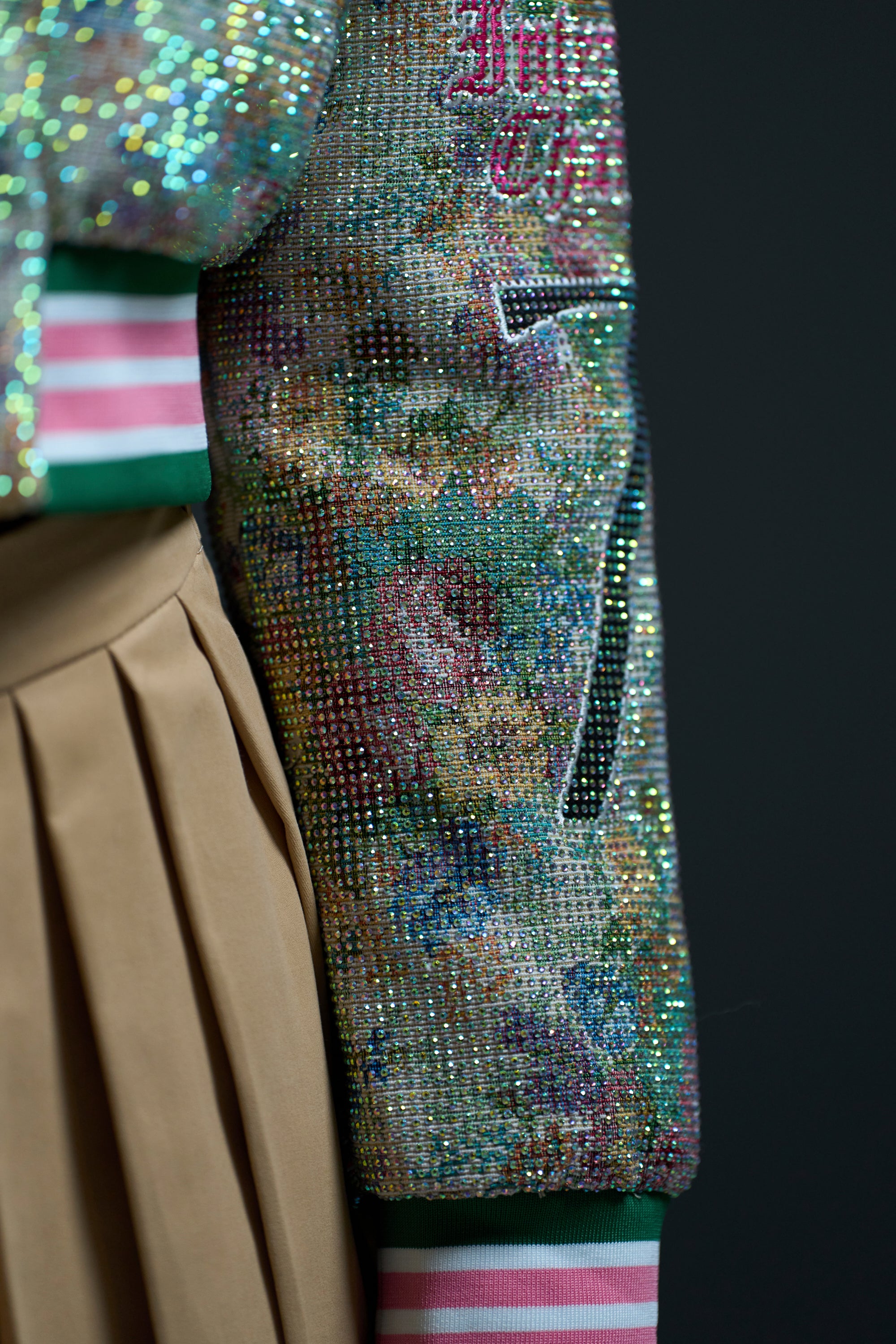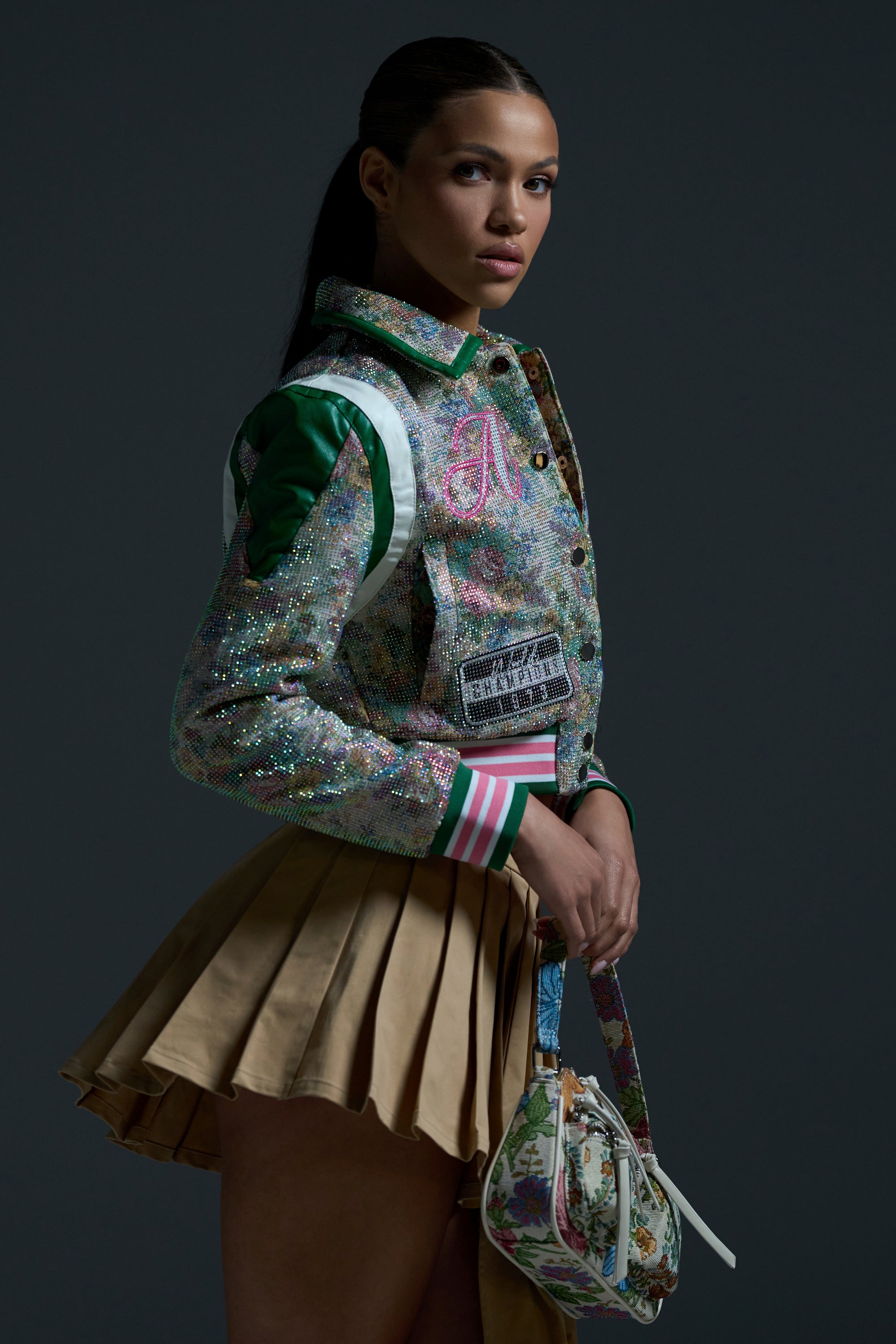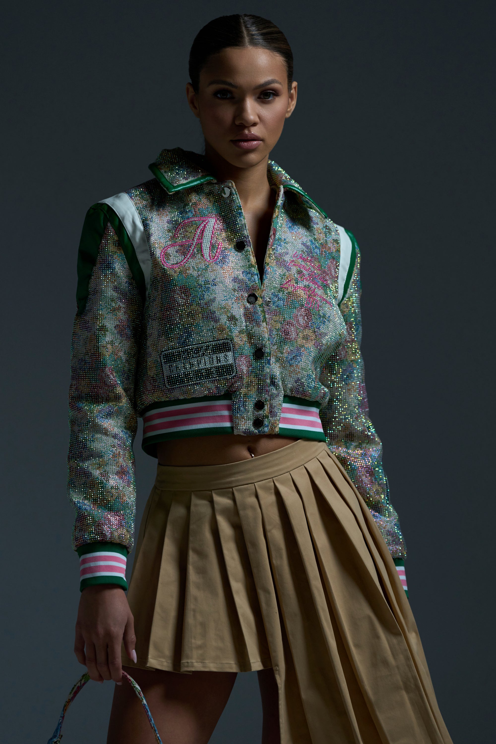 Get your head in the game with The AKIRA Label Tapped Out Rhinestone Bomber. Crafted from structured brocade fabric with contrasting faux leather panel trim detailing, this blinged out jacket boasts a pointed collar, long sleeves with striped ribbed knit cuffs, a coordinating hem, dual waist pockets, and metallic snap button closures. It also features contrasting embroidered phrases and patches on the front, back, and sleeves. Complete with a quilted, silky inner lining and a boxy, cropped fit. Pair with baggy cargo pants and platform sneakers for a finished look.