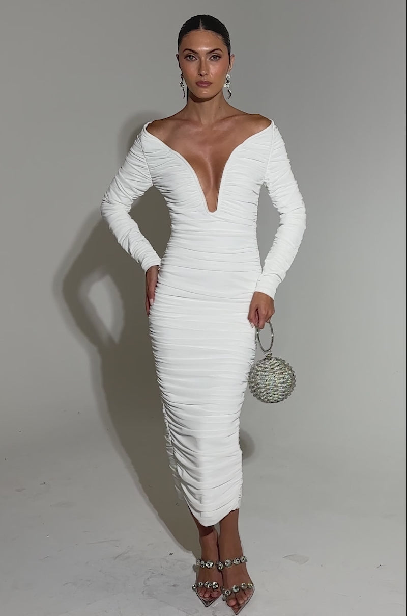 White hot! The AKIRA Label Taraji Bandage Midi Dress with Mesh Overlay is crafted from a bandage base fabrication that hugs your curves in all the right places. It features a classy midi-length silhouette, an off-the-shoulder design, a plunging, wire-reinforced neckline, long sleeves with discreet zipper details, and a delicately draped mesh overlay with flattering ruching throughout. Complete with a tonal zip-back closure and a modest back slit for easy mobility.