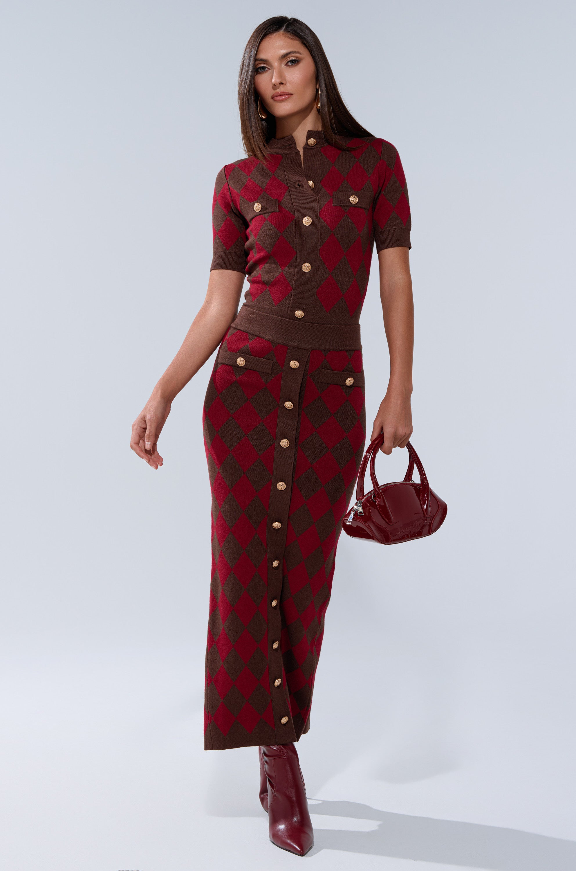 The AKIRA Label The Best Part Of This Abstract Cardigan is crafted from a cozy knit fabric with a two-tone argyle print and features ribbed knit hemlines, a mock neck, short sleeves, mock chest pockets with ornate gold-tone buttons, and a center-front panel of coordinating button closures. Complete with a snug, cropped fit. Pair with the matching AKIRA Label The Best Part Of This Abstract Maxi Skirt, strappy stilettos, and a vampy lip for a finished look.