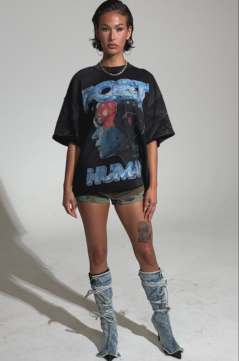 Answer the call of tomorrow in the Future’s Calling French Terry Graphic Tee. Crafted from soft, mid-weight French terry fabric, this oversized tee delivers all-day wearability with an edge. It features a ribbed knit crew neckline, reverse-styled seaming, short sleeves, drop shoulders, a raw hemline, and futuristic text and graphics across the front and back. It’s adorned with tonal stud detailing throughout its entirety. Complete with an easy, pull-on fit.