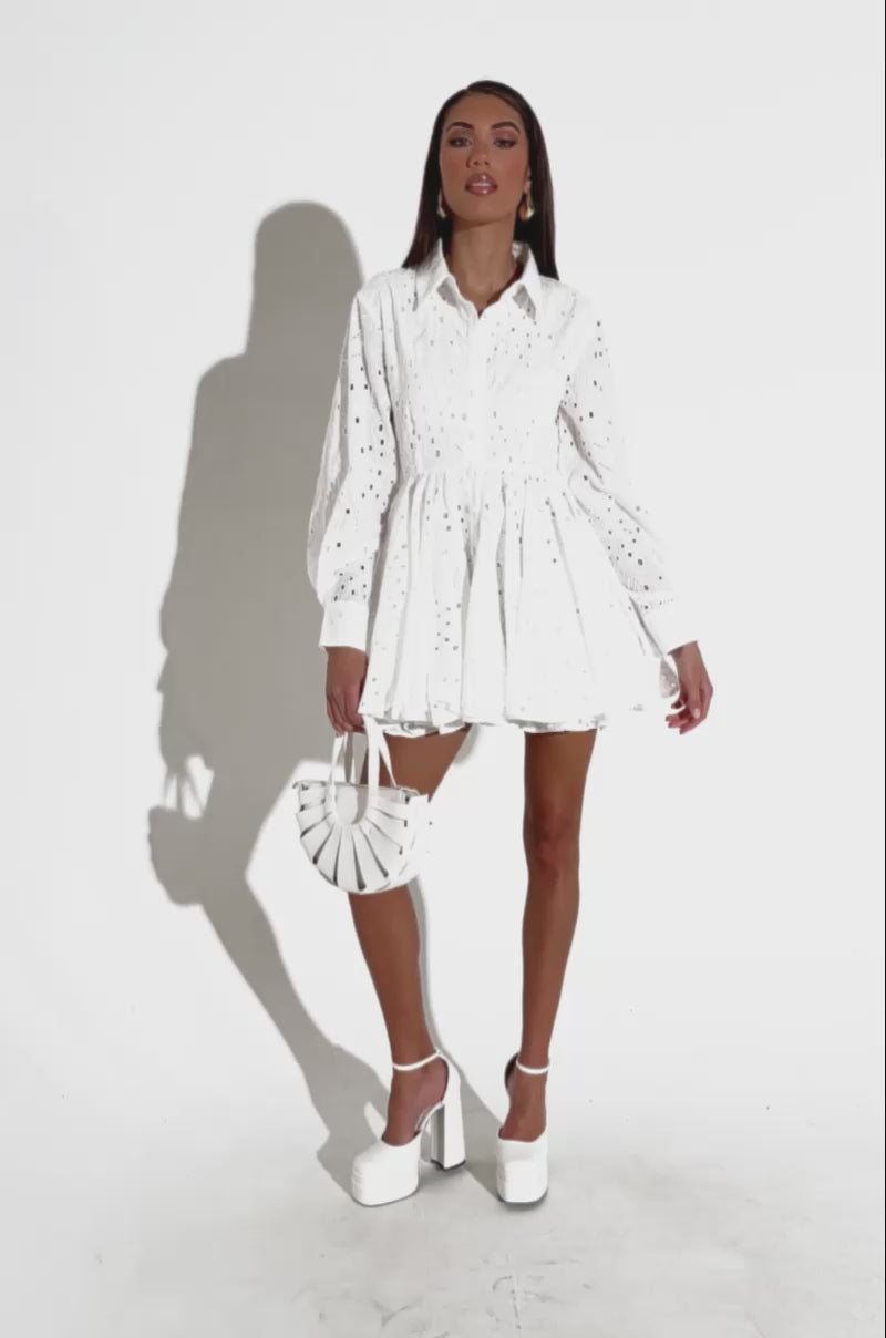 The spotlight is yours in The AKIRA Label The It Girl Mini Dress In Eyelet. This fiercely feminine frock is crafted from a crisp cotton fabrication and features an adorable eyelet pattern throughout, a pointed fold-over collar, a tonal button down front closure, long button cuff sleeves, and a flouncy, full-bodied pleated skirt. Style it with lacy white socks and platform mary janes and embrace your It-Girl status.