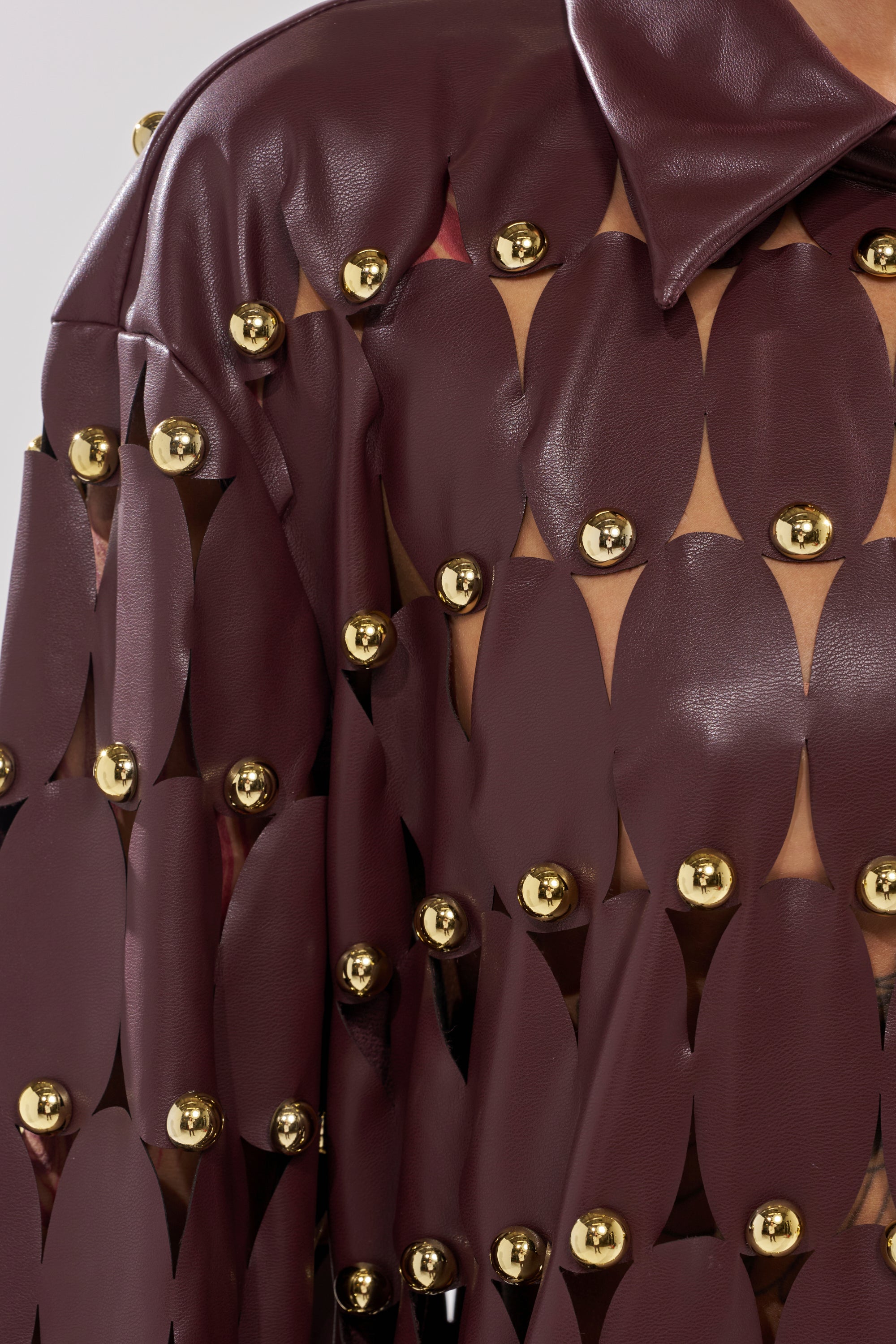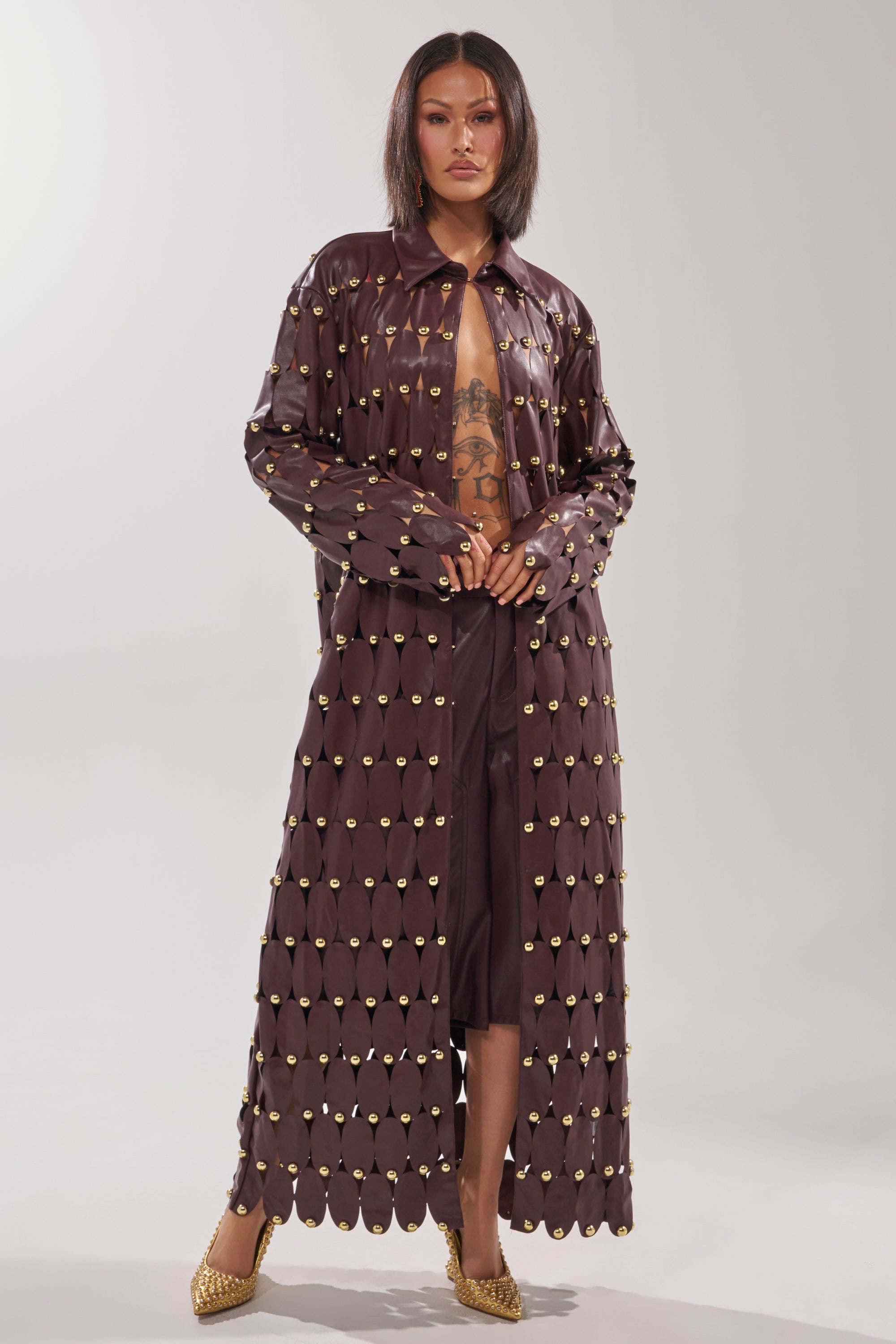THE SNEAK PEEK STUDDED PU LONG CARDIGAN IN BURGUNDY
