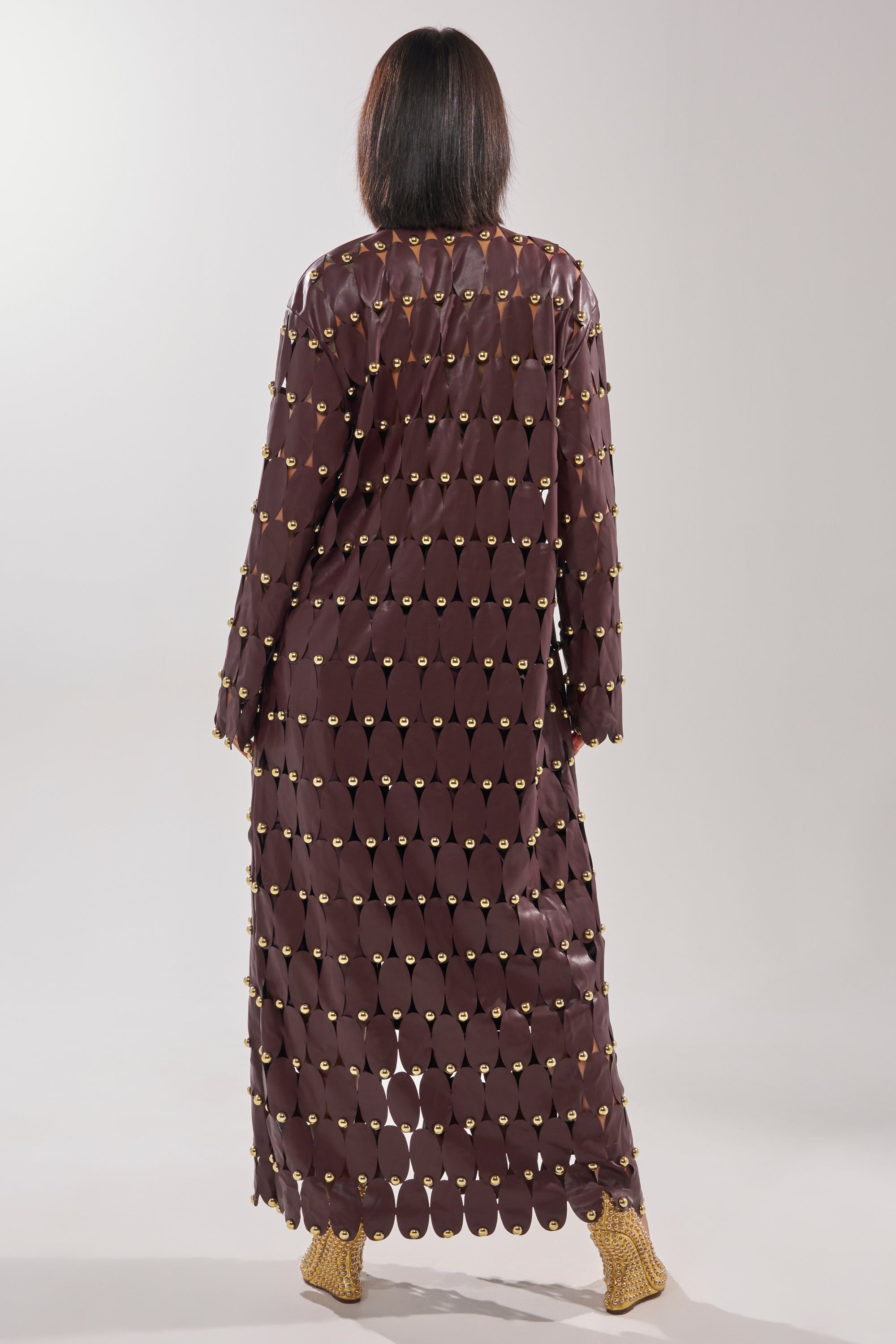 The AKIRA Label The Sneak Peek Studded PU Long Cardigan In Burgundy is crafted from sleek faux leather in a burgundy colorway and boasts an unlined oval cut out design adorned with gold-tone metallic stud hardware. It features a pointed collar, long sleeves, concealed hook-and-eye front closures, and a scalloped hemline. Complete with an elegant, longline silhouette.