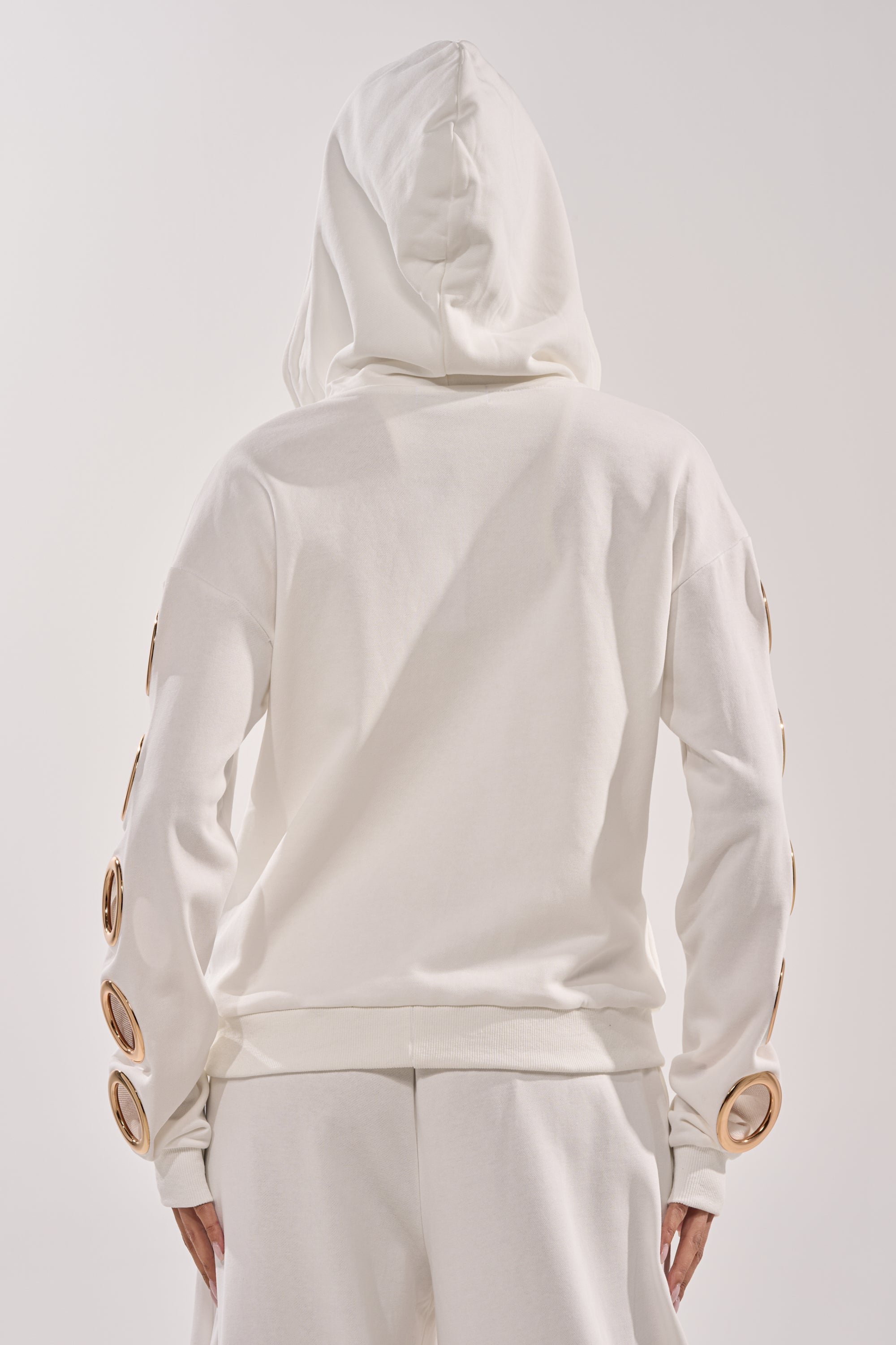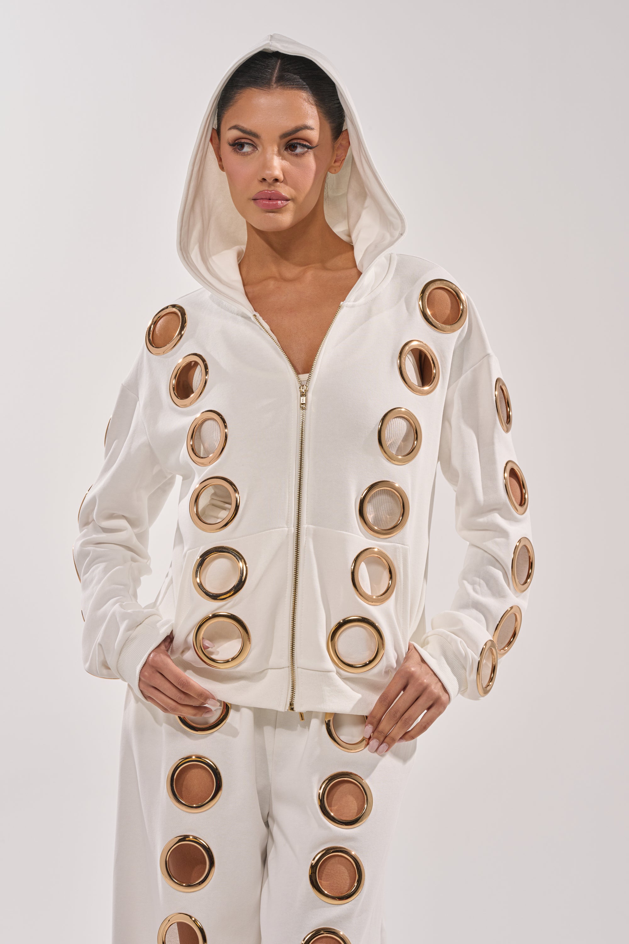 Statement-making white zip-up hoodie accented with bold oversized gold grommet ring detailing, perfect for luxe streetwear looks, travel days, or elevated off-duty styling. Featuring a relaxed hooded silhouette with a full front zipper and dramatic metal hardware along the shoulders and pockets, this piece brings a high-fashion edge to everyday comfort. Pair with the matching AKIRA Label Through The Night Wide Leg Sweatpant With Holes In White for a coordinated set that turns casual into couture.