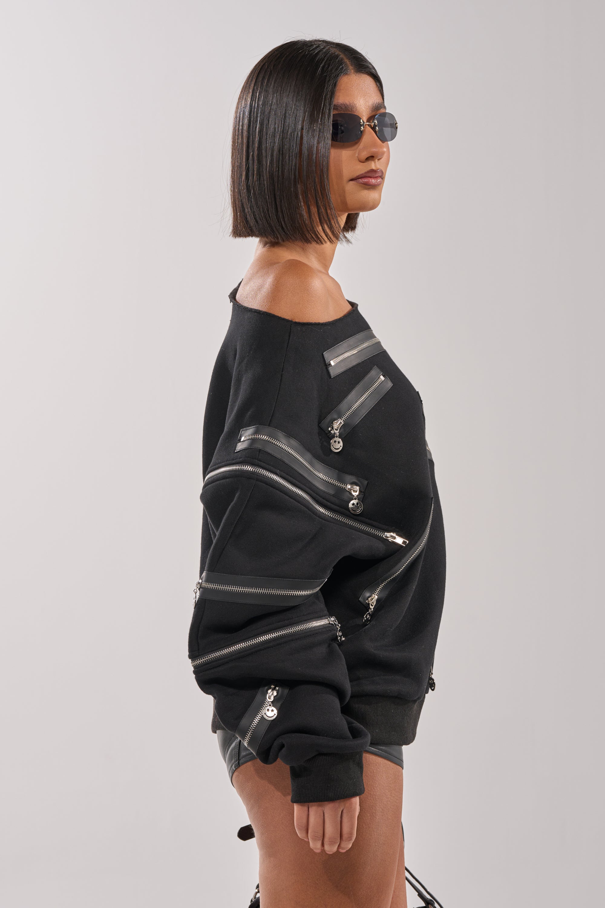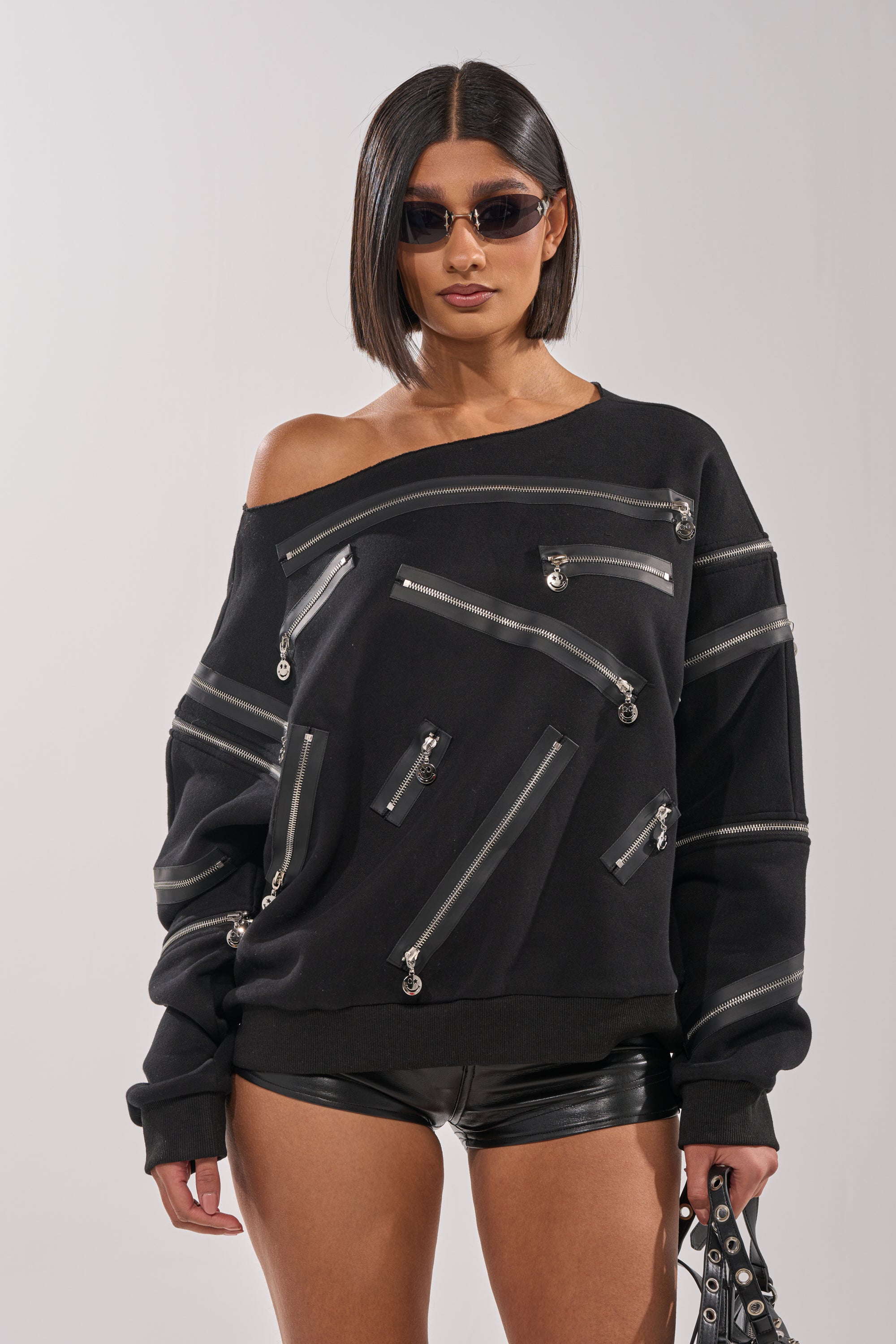 UN-ZIP ME OFF THE SHOULDER SWEATSHIRT