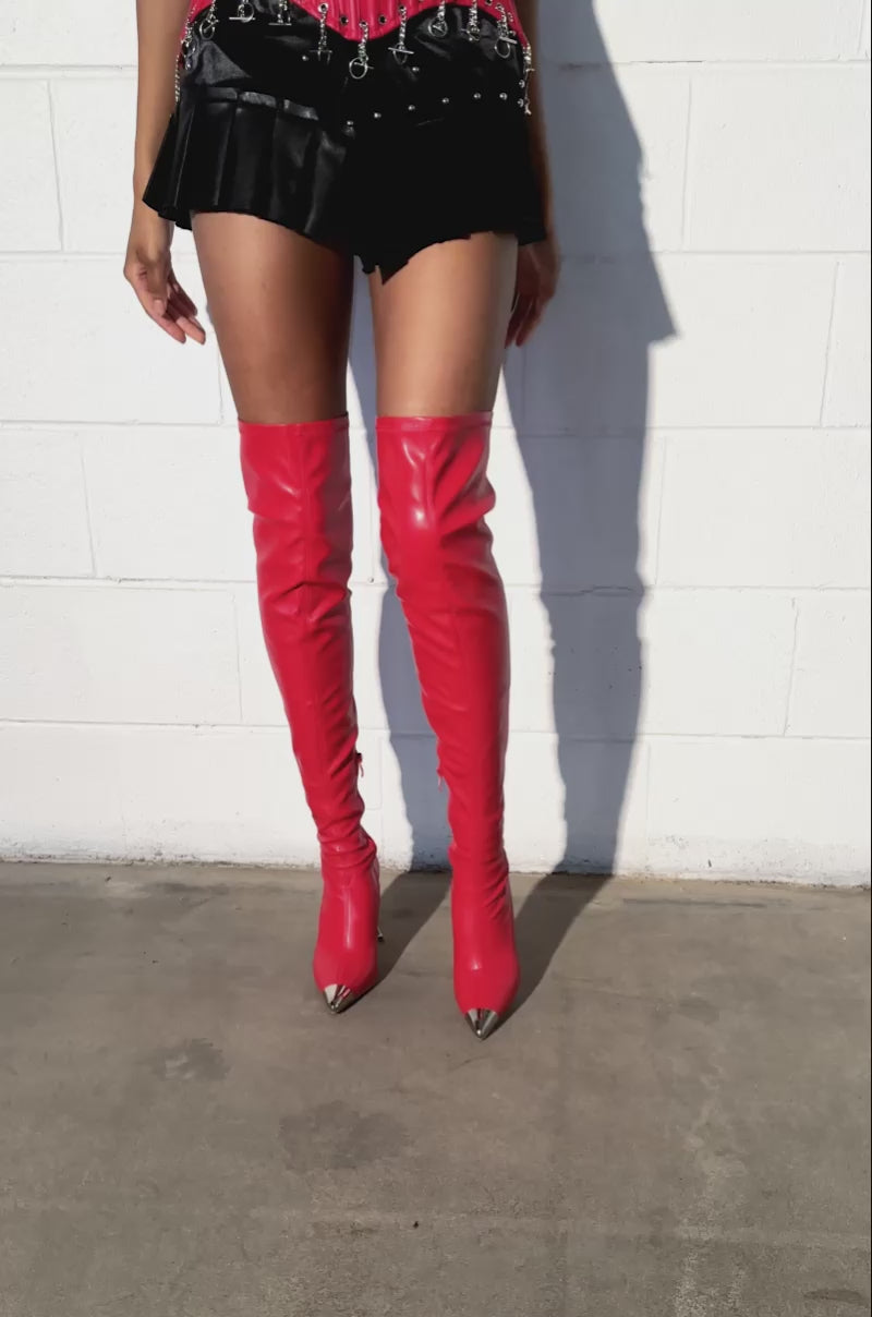 Step into your Red Era in the Una Red Stiletto Boot. These strut-worthy shoes are crafted from supple, subtly textured faux leather and feature a sexy thigh-high silhouette, a pointed toe with a metallic silver accent cap, a uniquely sculpted, coordinating silver stiletto heel, tonal stitching throughout, and an inner ankle zipper closure.