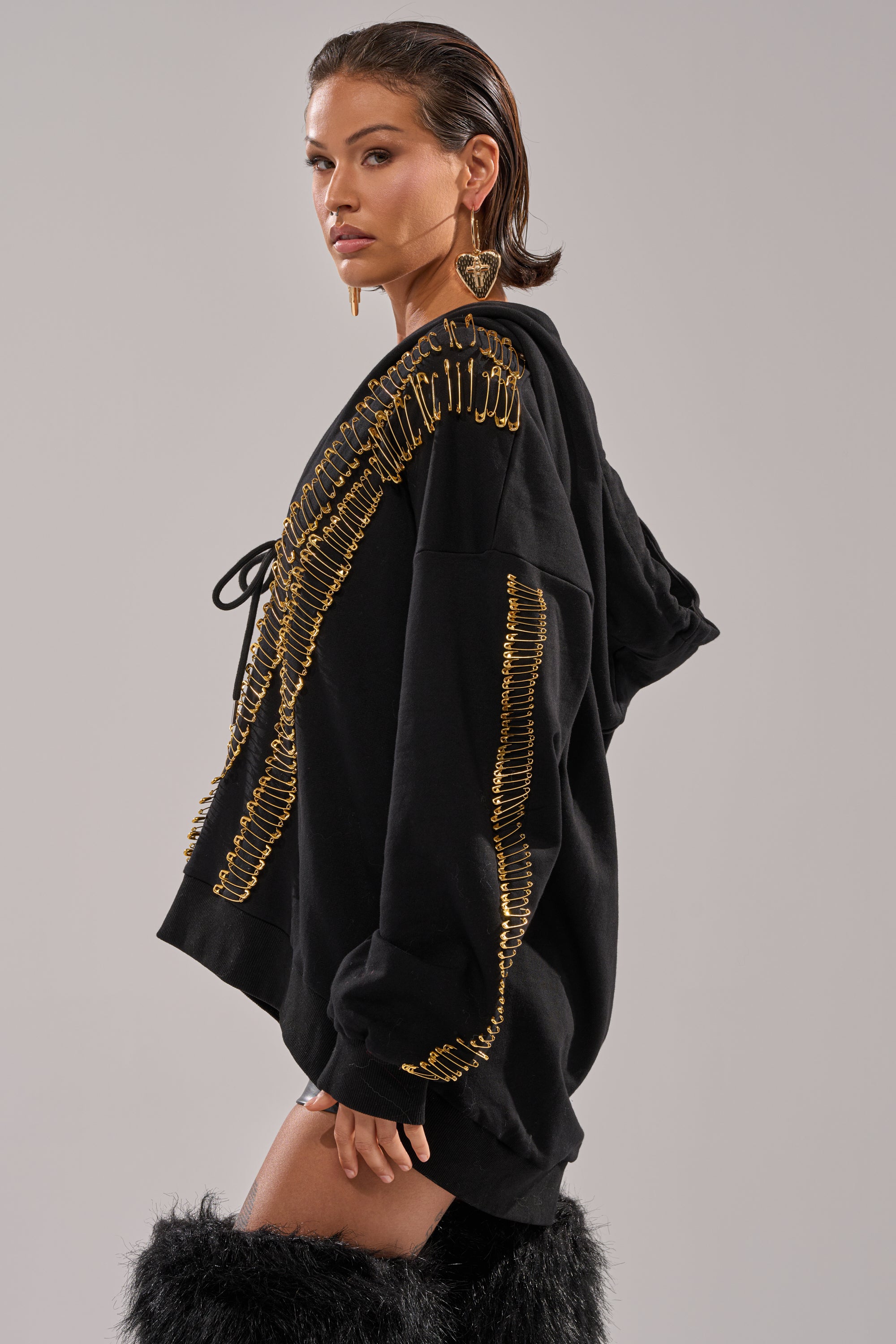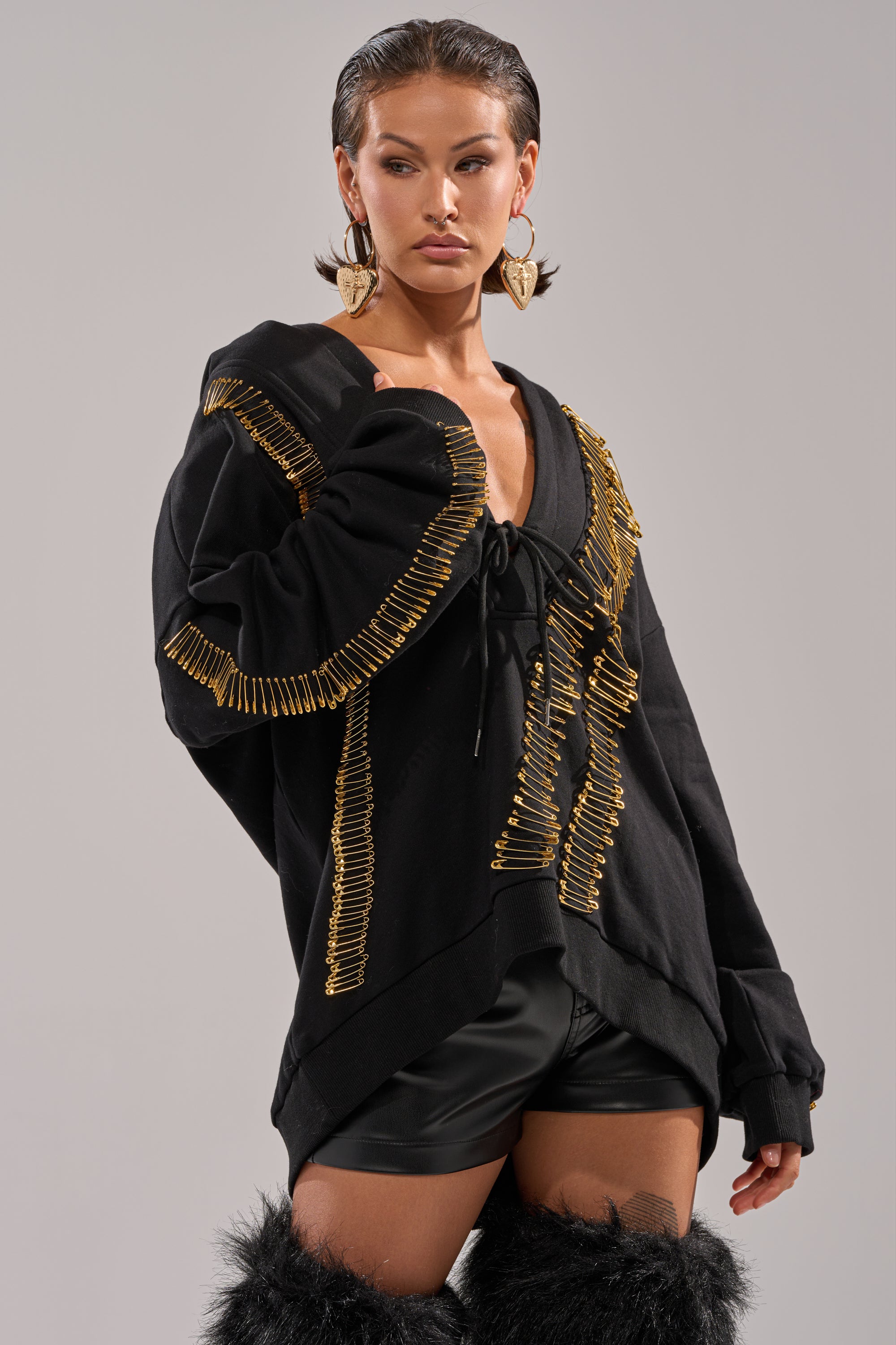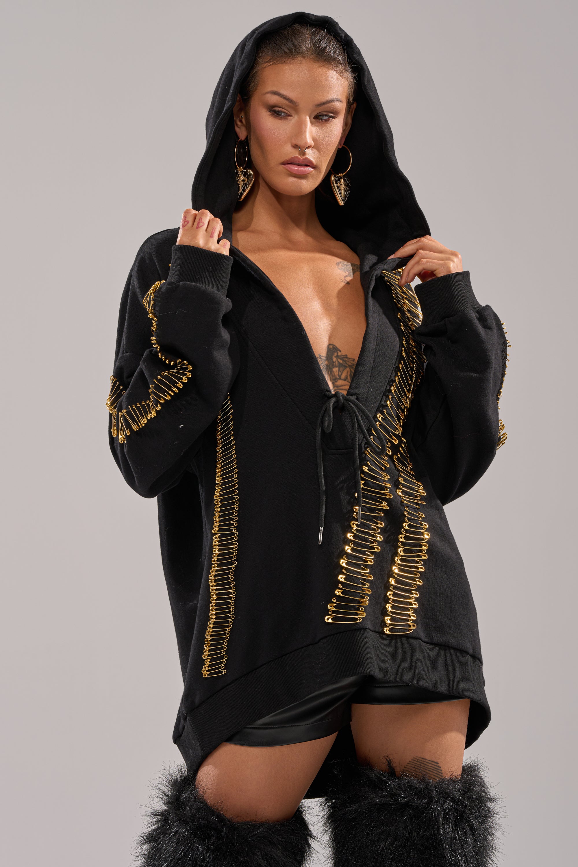 Bring bold, elevated street energy to your off-duty look with The AKIRA Label Unpin Me Oversized Sweatshirt. Crafted from a cozy cotton, this hoodie features a plunging neckline with a self-tie closure at the sternum, an attached spacious hood, long sleeves with tonal ribbed knit cuffs, a coordinating hemline, and lined with gold metal safety pin accents that cascade across the front and sleeves. Complete with a relaxed, oversized fit. Style with leather pants, cargo minis, or denim to turn casual comfort into a fashion statement.