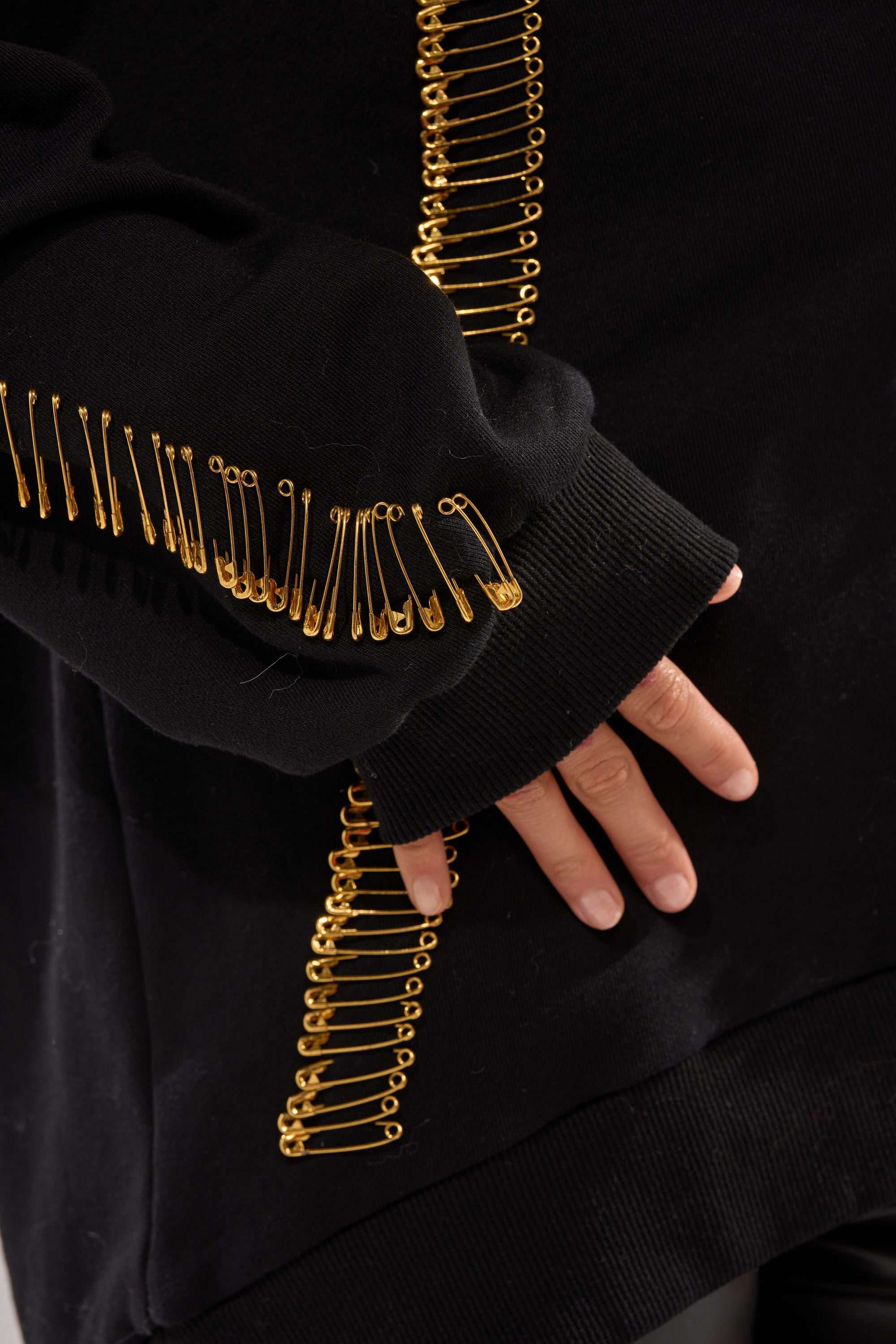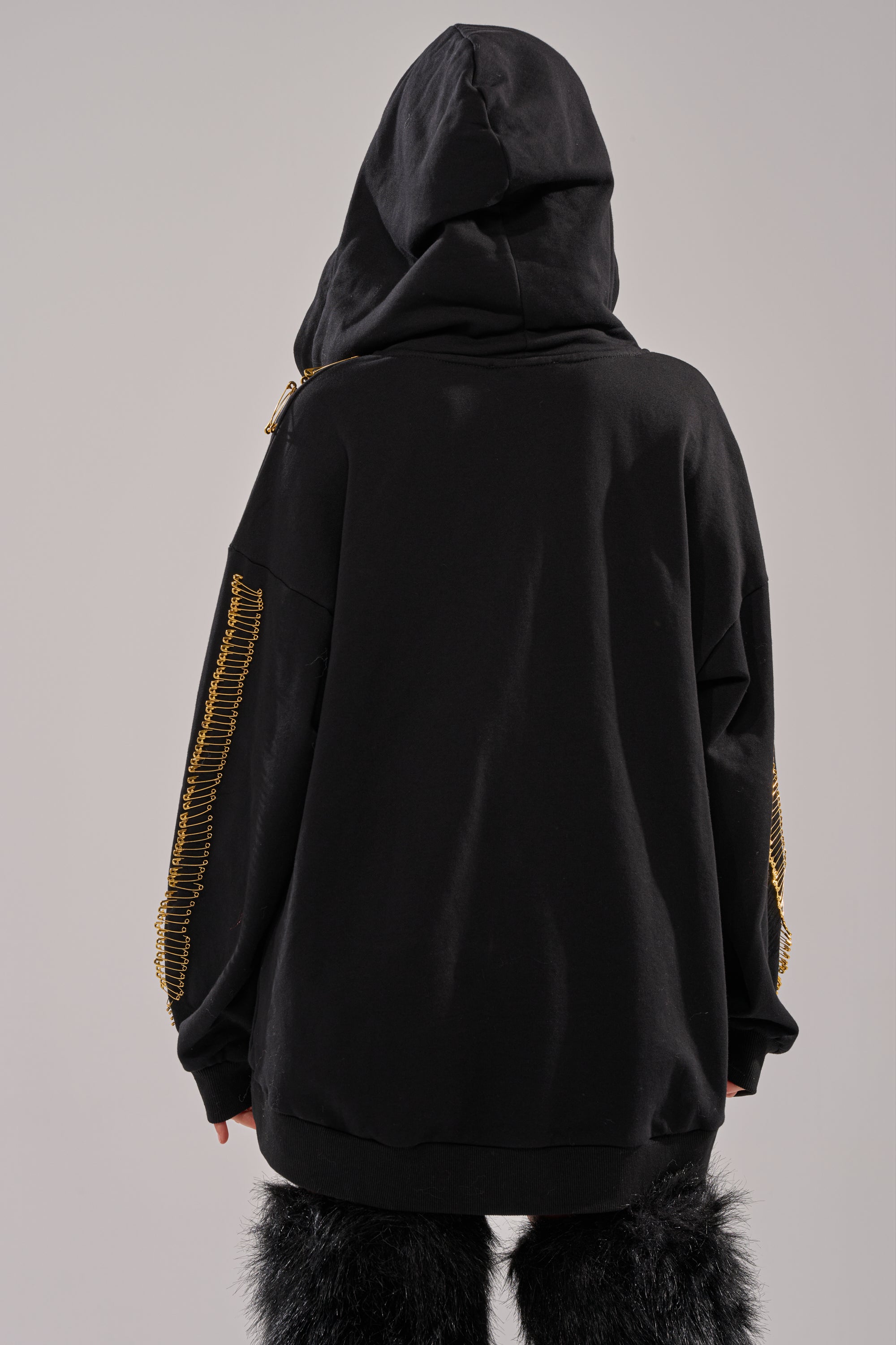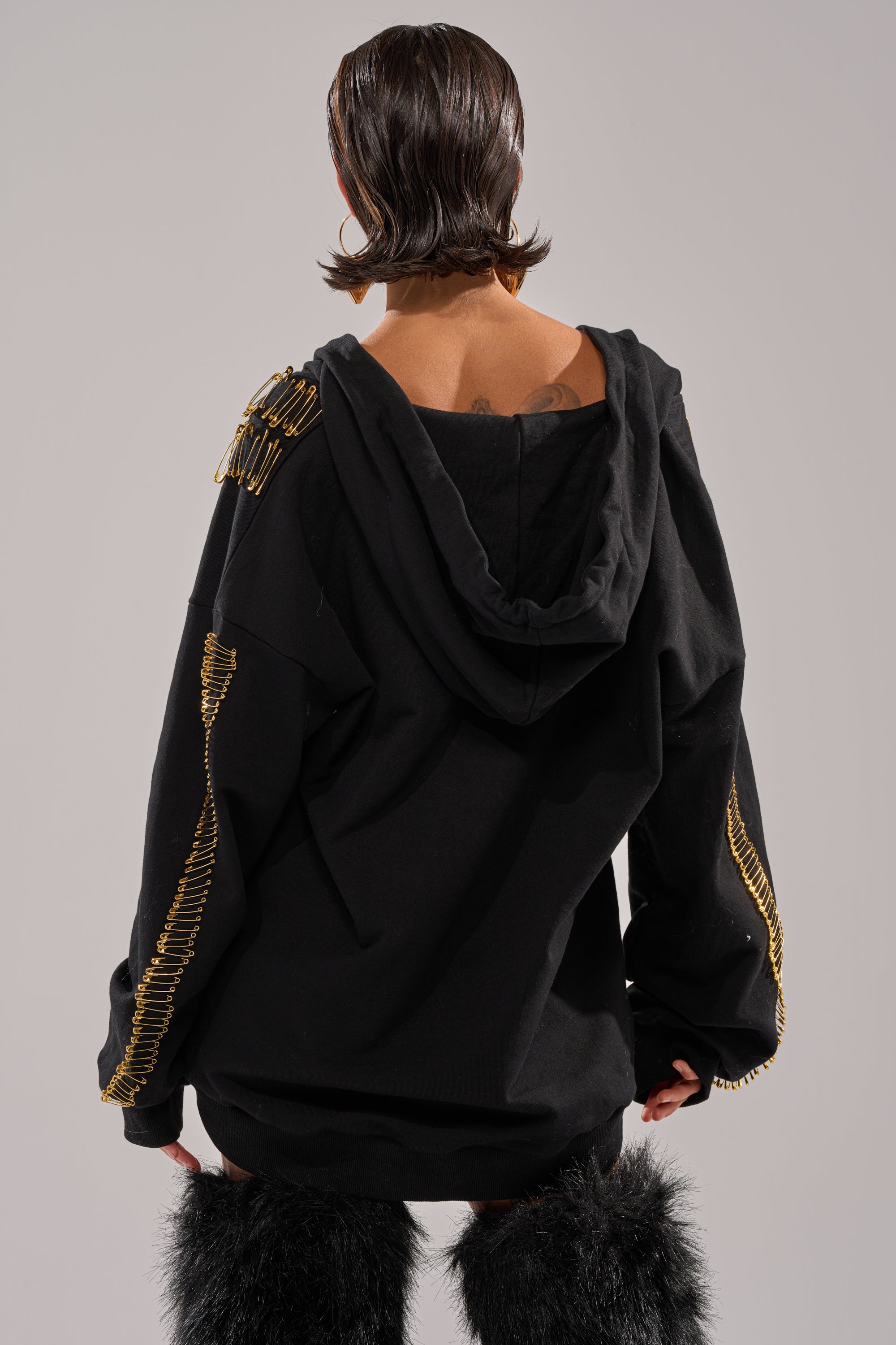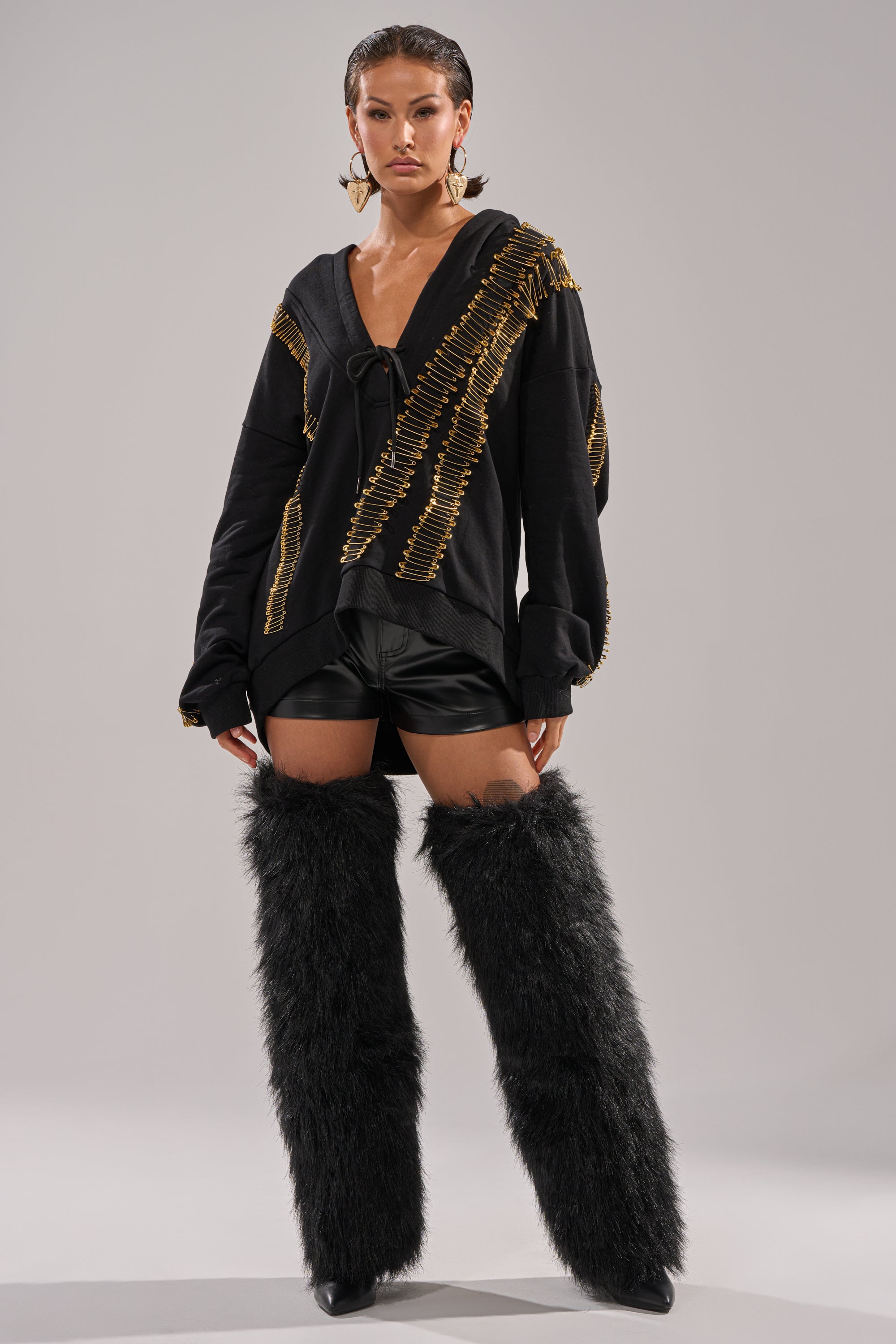 Bring bold, elevated street energy to your off-duty look with The AKIRA Label Unpin Me Oversized Sweatshirt. Crafted from a cozy cotton, this hoodie features a plunging neckline with a self-tie closure at the sternum, an attached spacious hood, long sleeves with tonal ribbed knit cuffs, a coordinating hemline, and lined with gold metal safety pin accents that cascade across the front and sleeves. Complete with a relaxed, oversized fit. Style with leather pants, cargo minis, or denim to turn casual comfort into a fashion statement.
