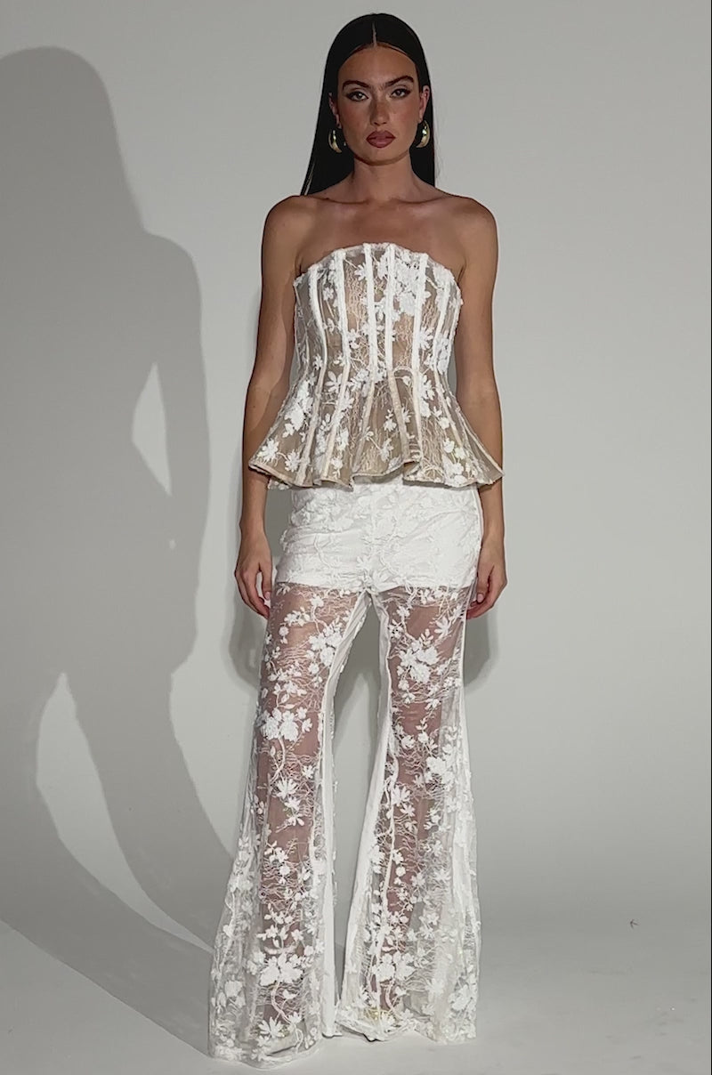 The AKIRA Label Up Next Lace Corset Top is an ultra-feminine statement piece that redefines modern romance. Crafted from double-lined floral lace, this structured top features tonal sequin embellishments interwoven throughout, a strapless neckline with inner elastic trim, a sculpted bodice with boning for support, and a flattering peplum flare that accentuates the waist. It’s complete with a nude inner mesh lining, a concealed back zipper closure, and a cropped fit. Pair it with the matching Up Next Lace Pant In White, kitten heels, and statement jewelry to finish the look.