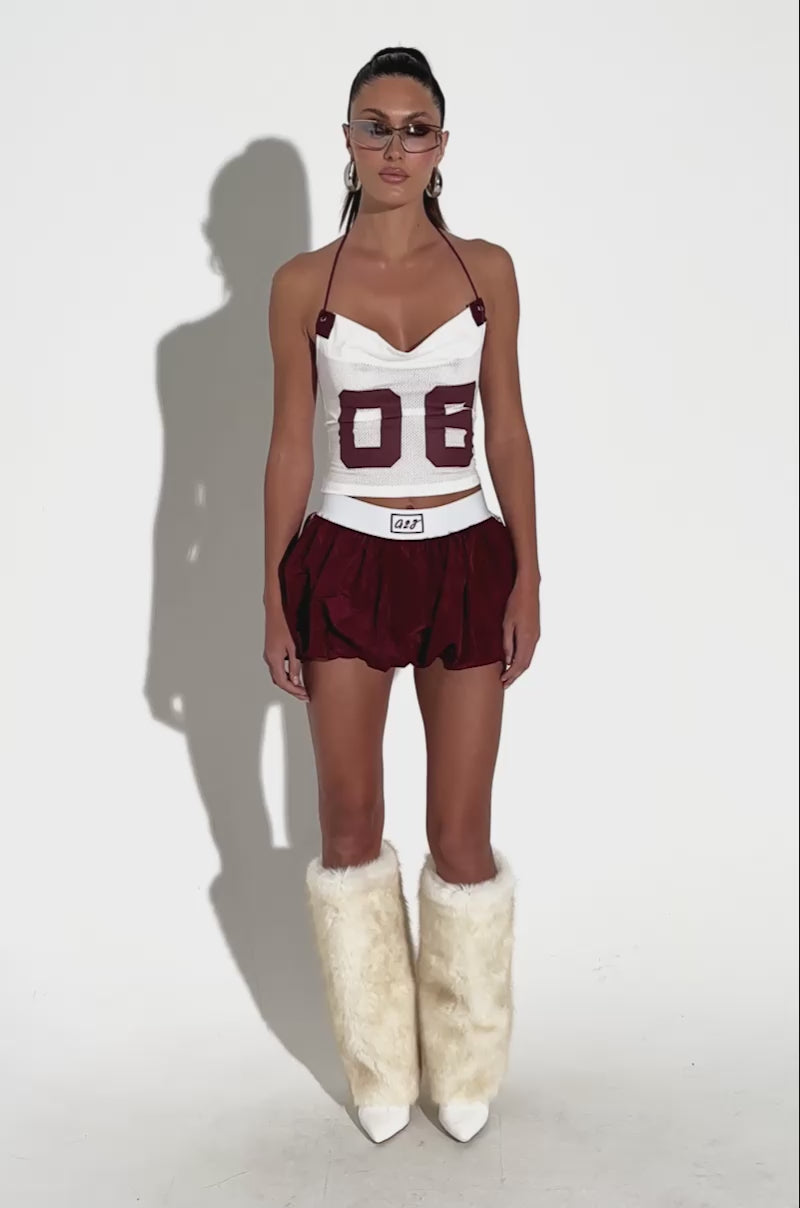 I wanna be your A-team, wanna be your first-string. The AKIRA Label Varsity Squad Tank is crafted from a stretchy, unlined mesh jersey fabrication and features a cropped, fitted silhouette, a straight neckline, thin, adjustable, shoelace-style halter straps, and a faux leather, adjustable lace-up back closure with coordinating laces and silver grommets. Complete with a prominent “06” jersey number on the front. Style with the matching Varsity Squad Bubble Mini Skirt for a sporty chic look that’s sure to land you a spot in the starting lineup.