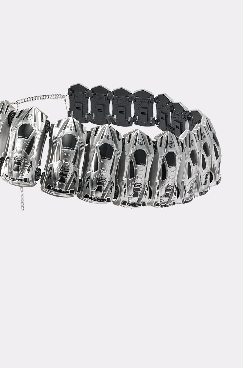 This silver-tone car-inspired statement belt features a bold, waist-cinching silhouette with linked metallic car-shaped panels, a high-shine chrome finish, and a structured design that adds a futuristic edge. Complete with an extended, adjustable lobster clasp closure for a customizable fit. Pair with low-rise denim, a fitted bodysuit, and heels for a standout Y2K or streetwear-forward look.