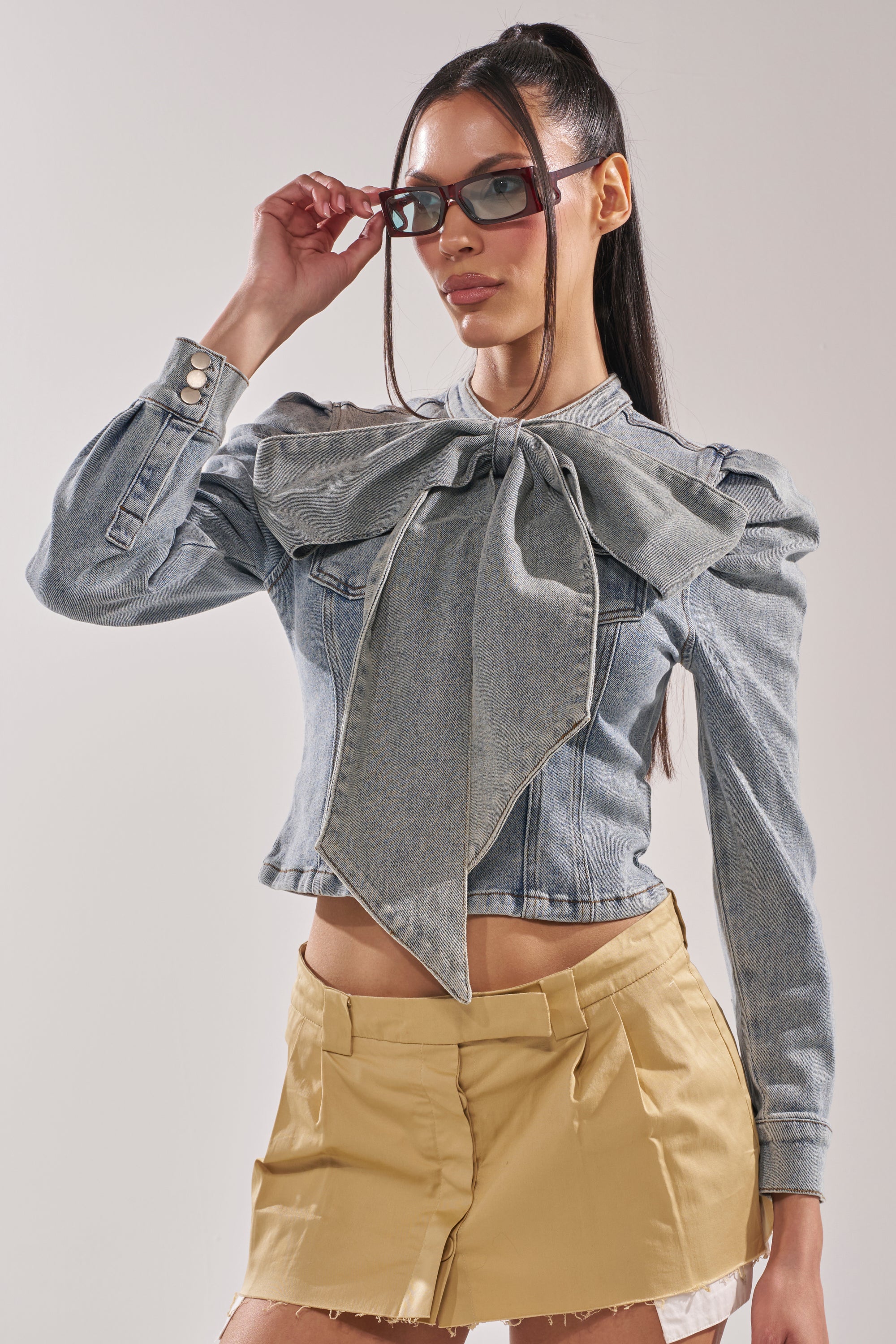 The AKIRA Label Wait For U Denim Bow Blouse Top is crafted from washed denim base and boasts a fitted bodice with dramatic puffed shoulders, long sleeves with buttoned cuffs, dual chest pockets, and an oversized bow applique at the collar that hangs down the front. Complete with an exposed back zipper closure. Pair with denim bermuda shorts and stiletto pumps for a denim-forward finish.