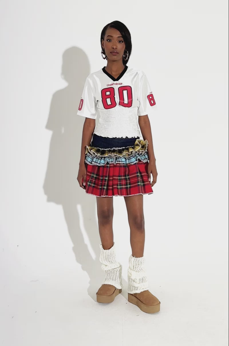 You’re the number one choice in The AKIRA Label Wanna Join My Team Scrunch Jersey. This sporty-chic top is crafted from a satin-inspired base and features a contrast ribbed knit v-neckline, short sleeves, an elongated ruched waistband with ruffle detailing at the bottom, and contrast “Championship 80” graphics on the chest and sleeves. Complete with a cropped, torso-hugging silhouette, and an easy, pull-on fit. Pair with baggy jeans and chunky sneakers to be Game Day ready.