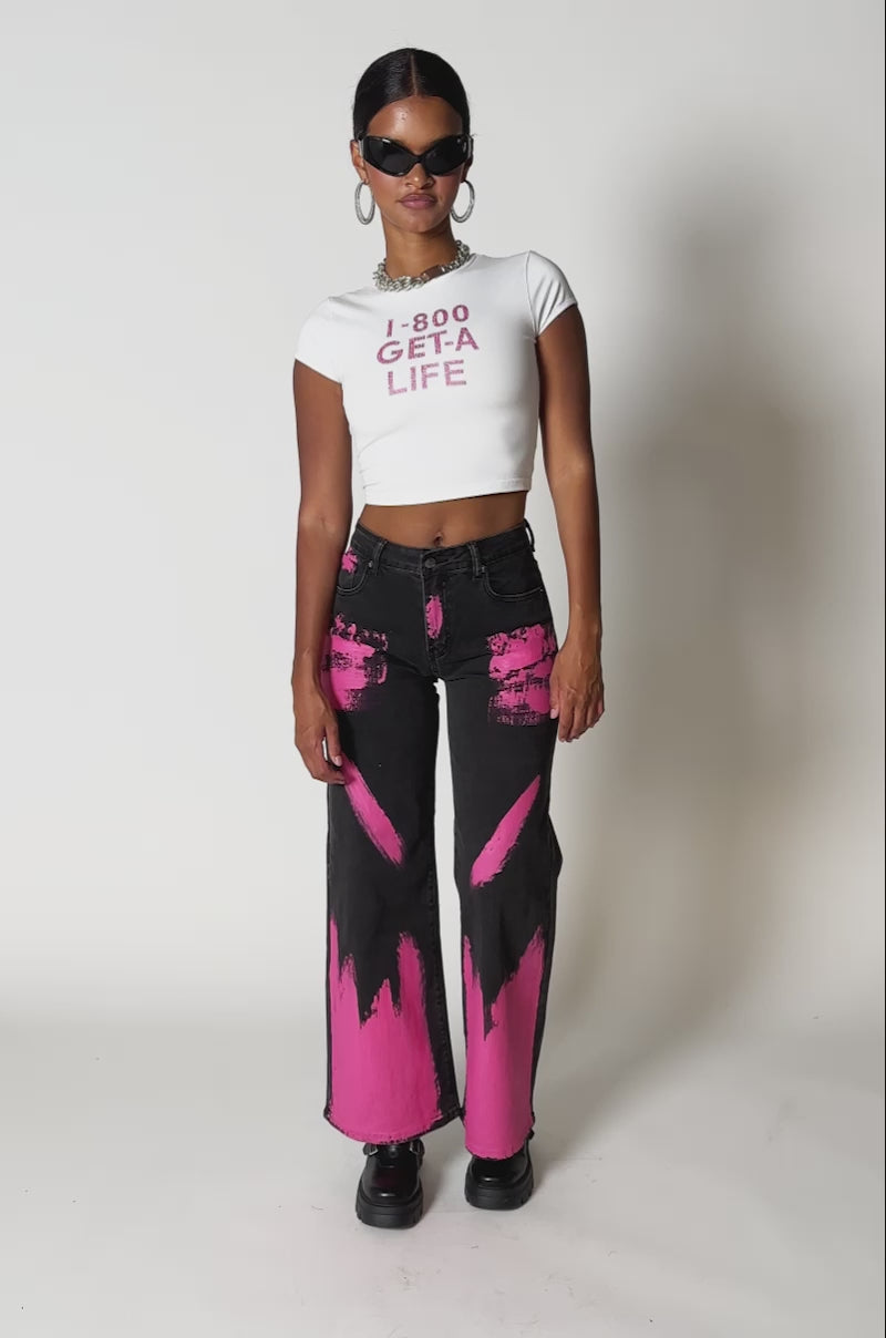 The AKIRA Label Washed Up Denim Pant is a high-rise, wide-leg jean crafted from a super stretchy denim fabrication. These crafty cuties feature a classic five-pocket design, functional belt loops, a zip-button front closure, and hot pink, abstract painterly details on each pantleg. Style them with a graphic tee and combat boots for an effortlessly cool vibe.